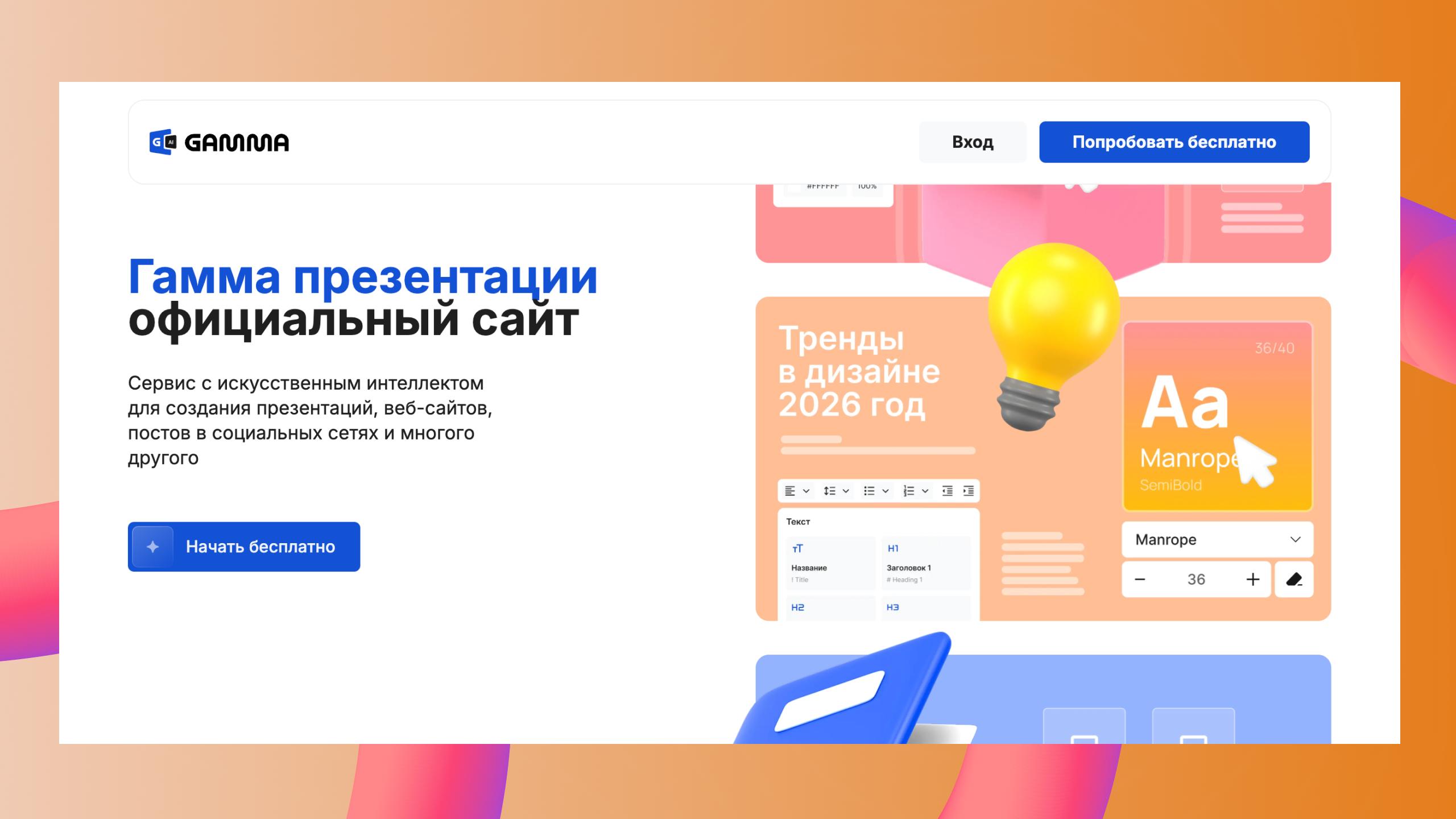 Gamma — один из самых популярных AI-сервисов для создания презентаций. Пользователь вводит тему или краткое описание будущего выступления, после чего нейросеть автоматически формирует структуру и генерирует слайды.