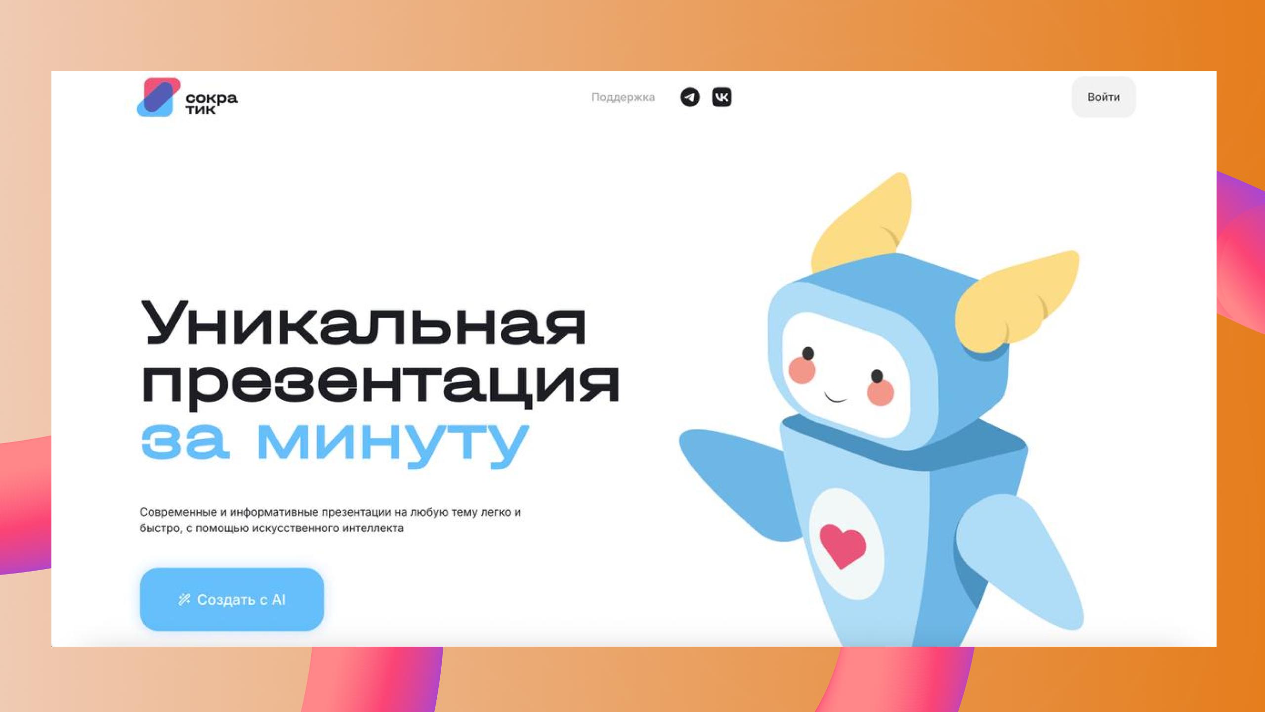 Сократик — российская платформа для генерации презентаций с помощью искусственного интеллекта. Пользователь задает тему, выбирает аудиторию и количество слайдов.