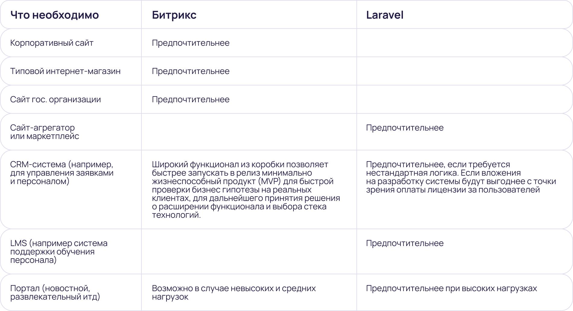 Битрикс оптимален для типовых решений вроде небольших интернет-магазинов или сайтов-визиток, так как для него существует множество готовых решений. Однако, если нужен уникальный функционал или нестандартная логика, то Laravel обеспечит большую гибкость и адаптируемость под любые задачи бизнеса. Он подходит для технически сложных проектов: CRM, LMS, агрегаторов и серверов для мобильных приложений.