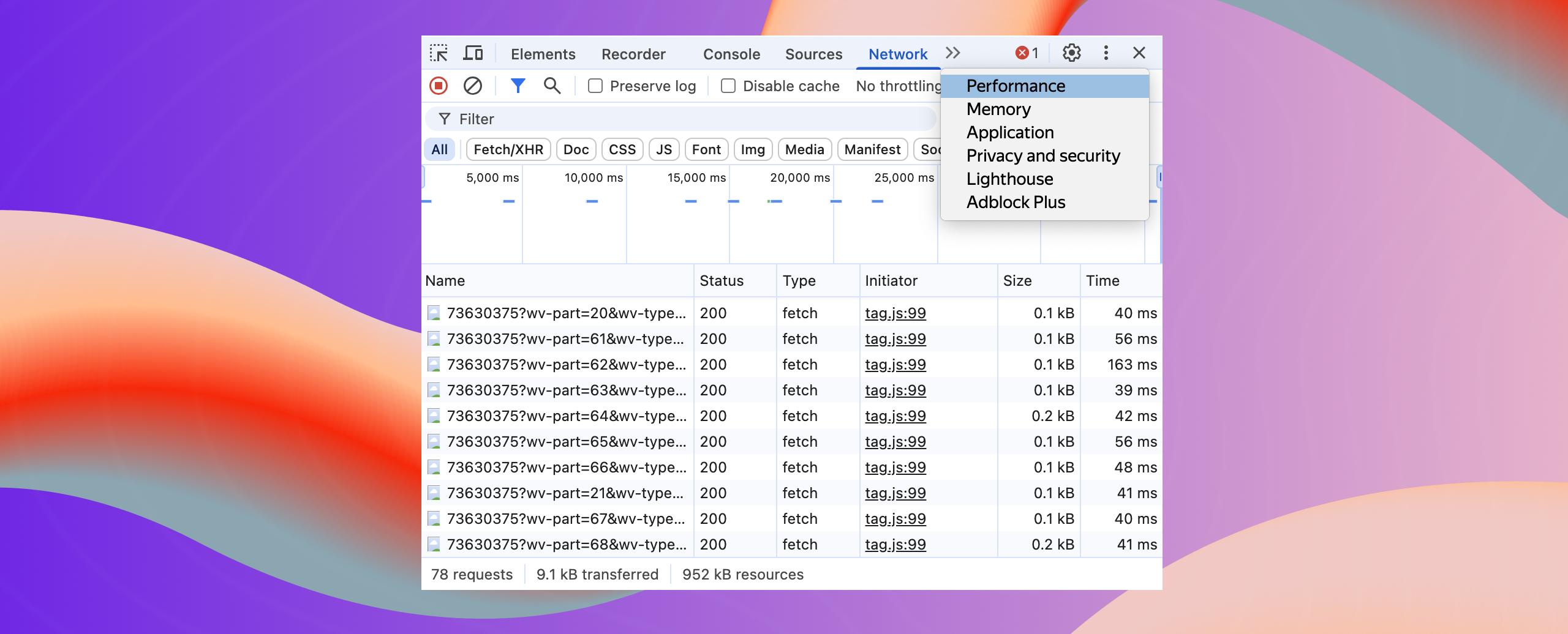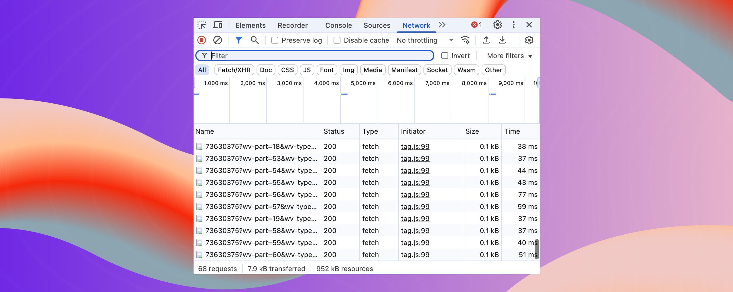 С помощью фильтров можно отображать определенные типы запросов (XHR или только изображения), чтобы быстро находить проблемы: например, если скрипт не загружается (ошибка 404) или API возвращает ошибку.