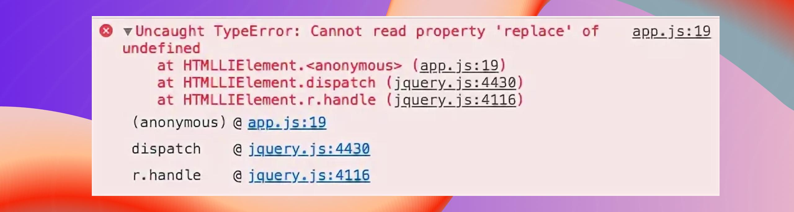 Если появились ошибки на сайте или вообще «что-то сбоит», в консоли появляется красное сообщение об ошибке: в каком файле и на какой строке случился сбой и где необходима отладка в JavaScript.