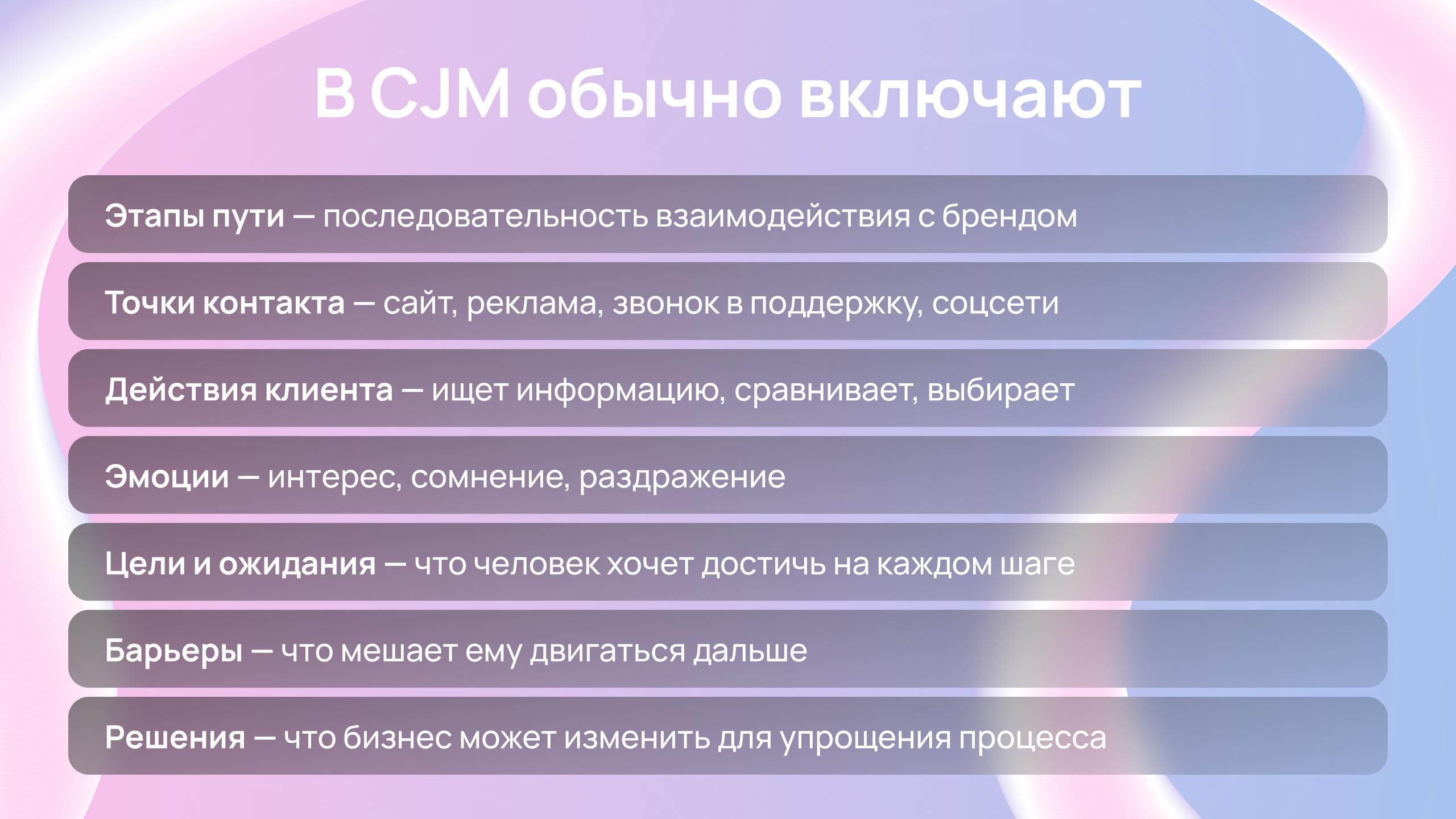 Главная задача CJM — показать все точки соприкосновения клиента с продуктом и подсветить, где он сталкивается с трудностями, что вызывает доверие, а что раздражение.