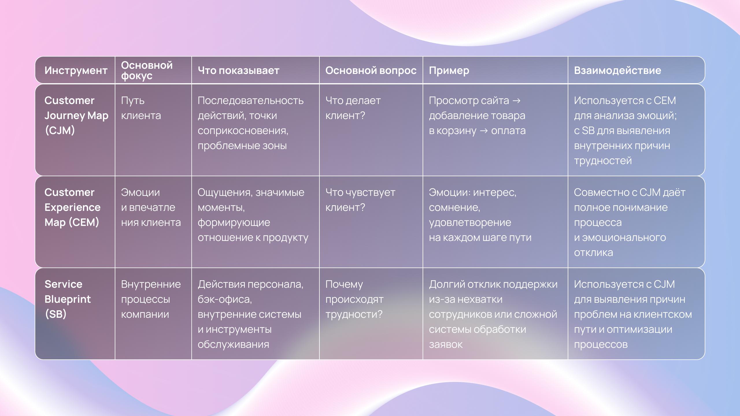 Использование этих инструментов в связке позволяет компании видеть полный контекст клиентского опыта: путь и впечатления снаружи, а также механизмы, формирующие этот опыт внутри. Такое комплексное понимание помогает выявлять слабые места, оптимизировать внутренние процессы, повышать качество обслуживания, сокращать издержки и укреплять лояльность клиентов.