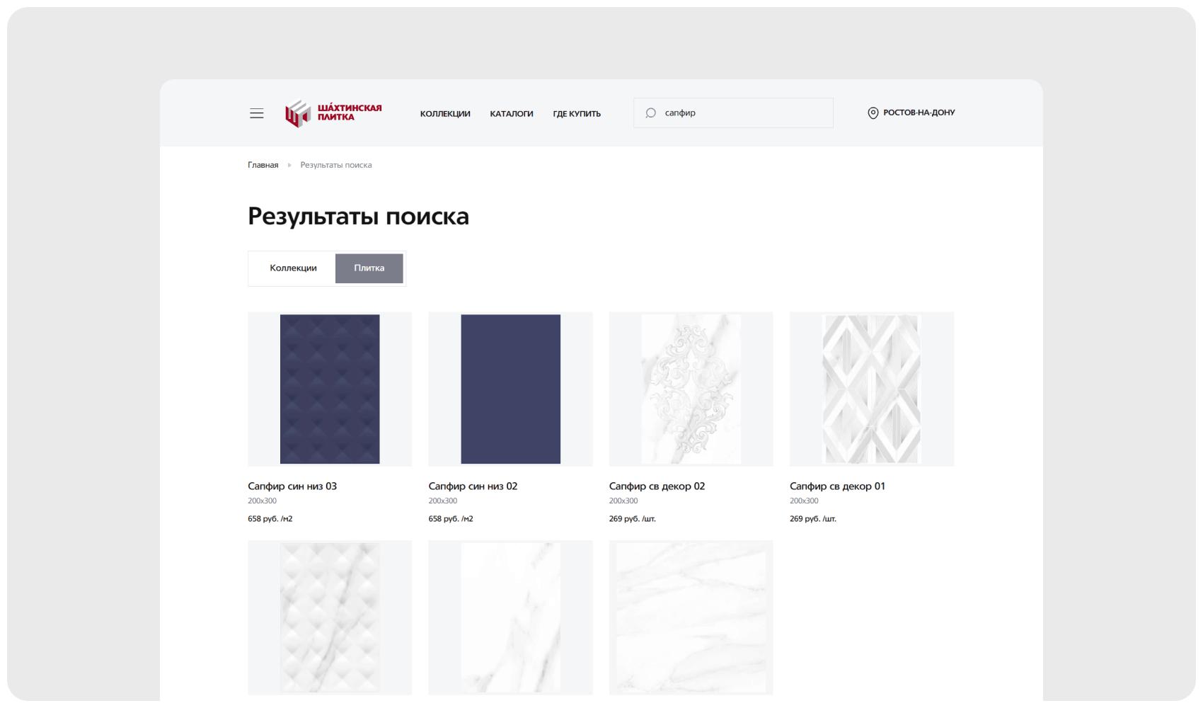 Для бренда «Шахтинская плитка» мы не просто разработали имиджевый сайт, но и внедрили функционал каталога. Это раздел сайта со всеми коллекциями и входящими в них товарами, ценой и адресами магазинов, где их можно приобрести.