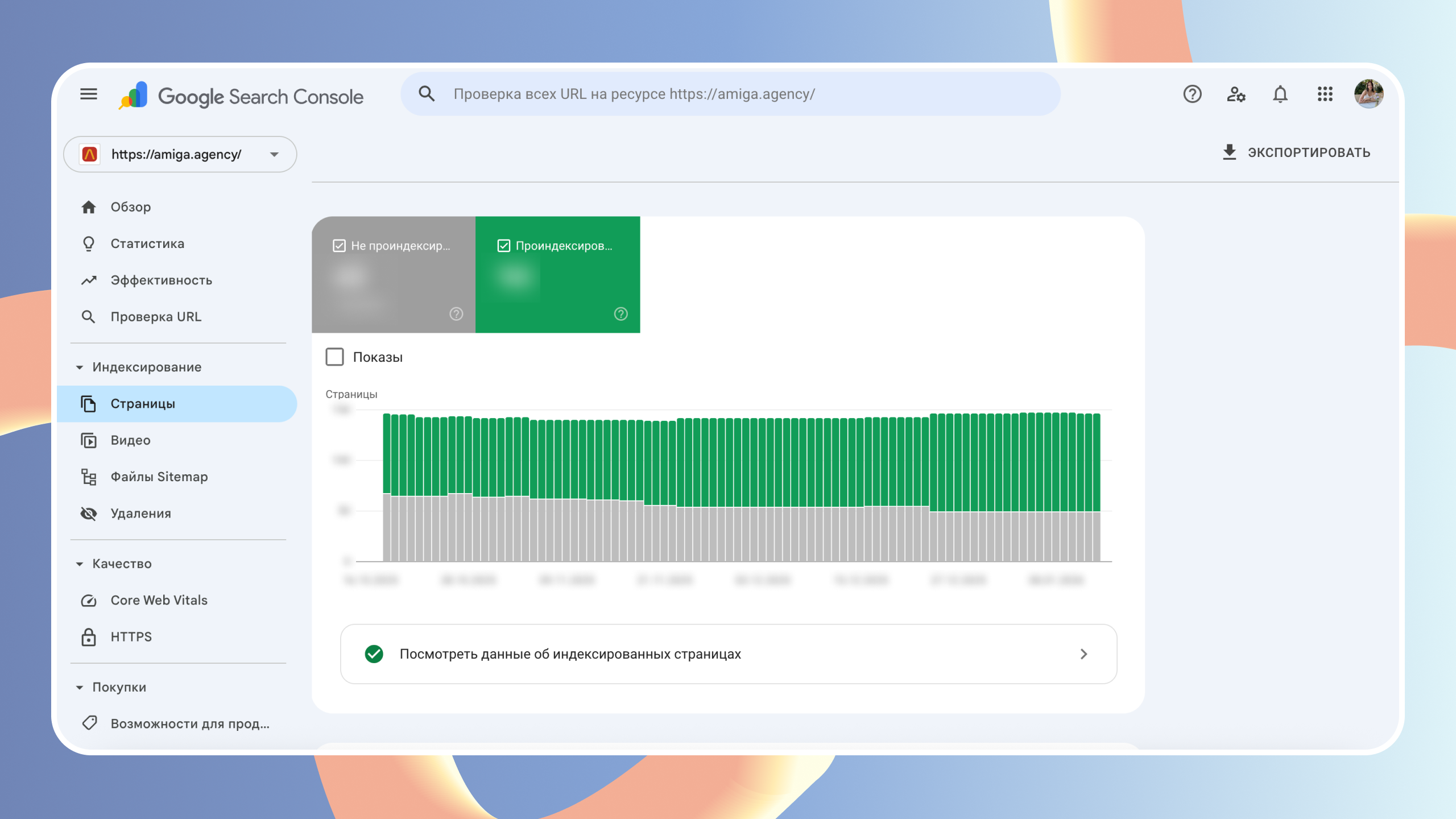 Раздел «Страницы» (Coverage) показывает статус индексации: