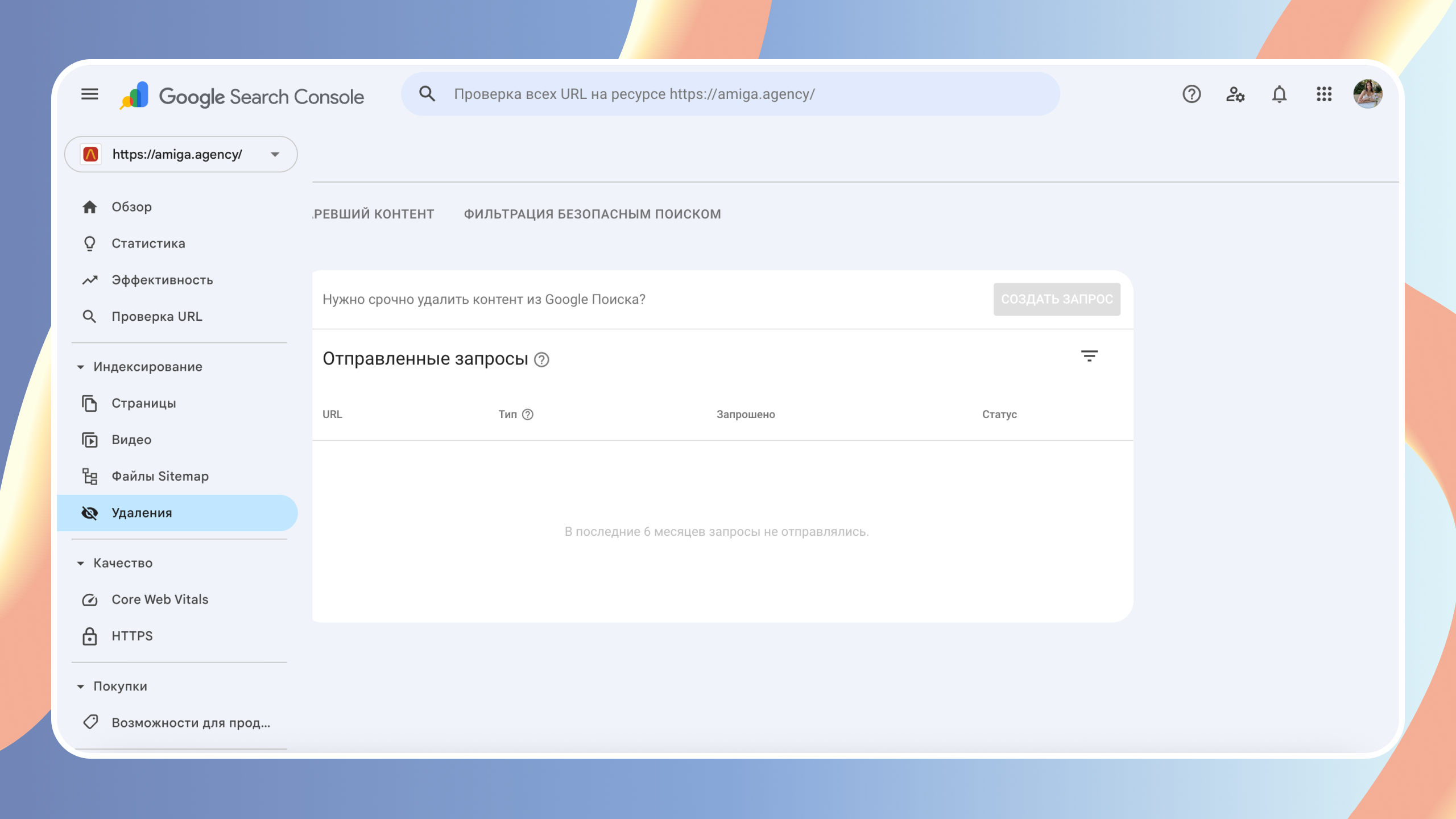 В разделе «Удаления» можно временно скрыть страницы из поиска, например при редизайне или ошибочной публикации.