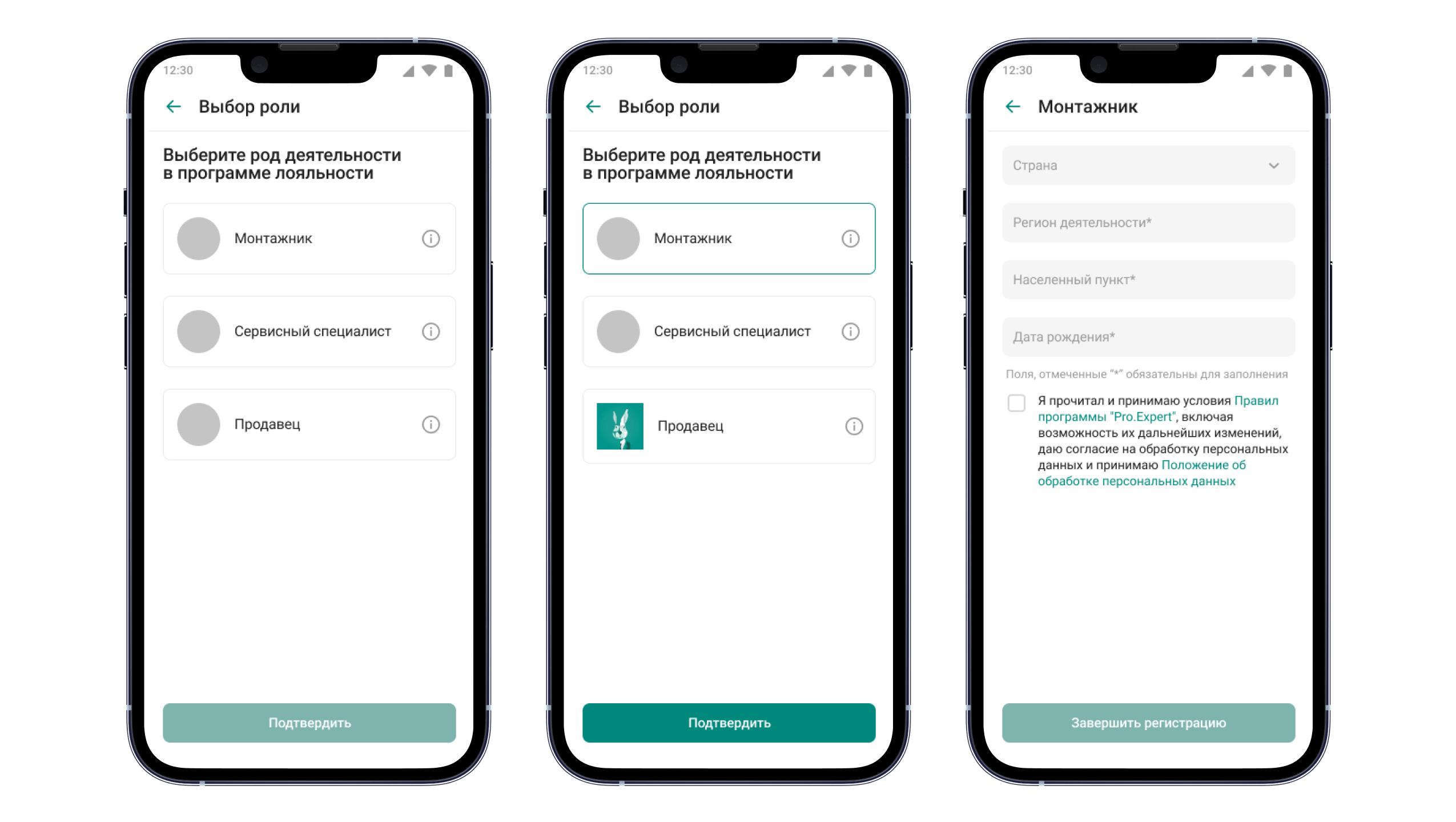 При регистрации доступен выбор роли: для каждого рода деятельности предусмотрен свой функционал и особенное накопление баллов. Flutter позволяет продумать бизнес-логику так, чтобы пользователю на любой платформе было интуитивно понятно заполнять данные.