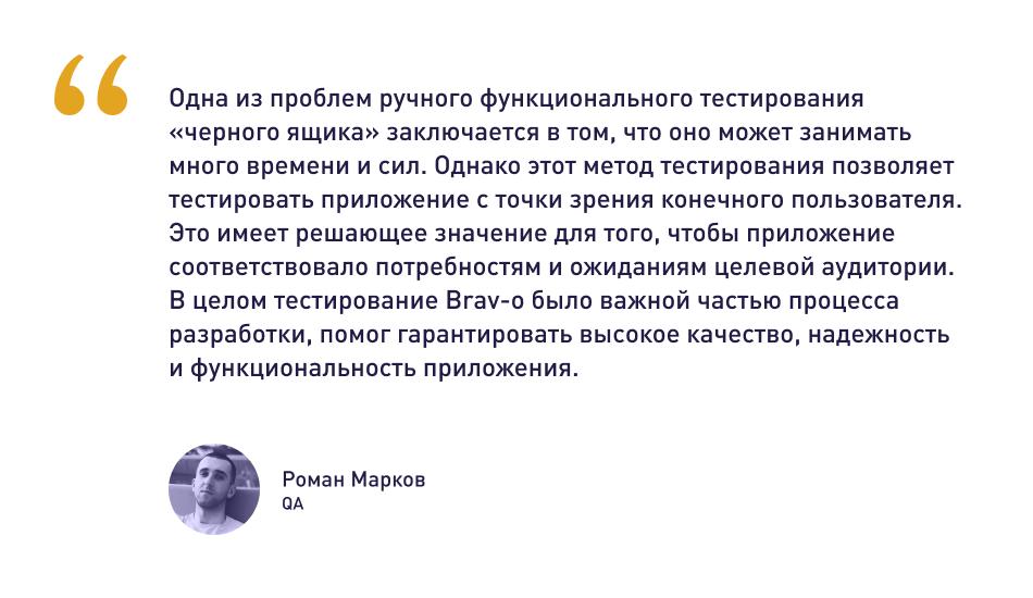 Процесс тестирования мобильного приложения Brav-o проводился с использованием ручного функционального метода черного ящика. Этот метод представляет собой тестирование функциональности приложения без какого-либо знания его внутренней структуры с использованием тестовых примеров, разработанных для охвата всех возможных сценариев и пограничных случаев.