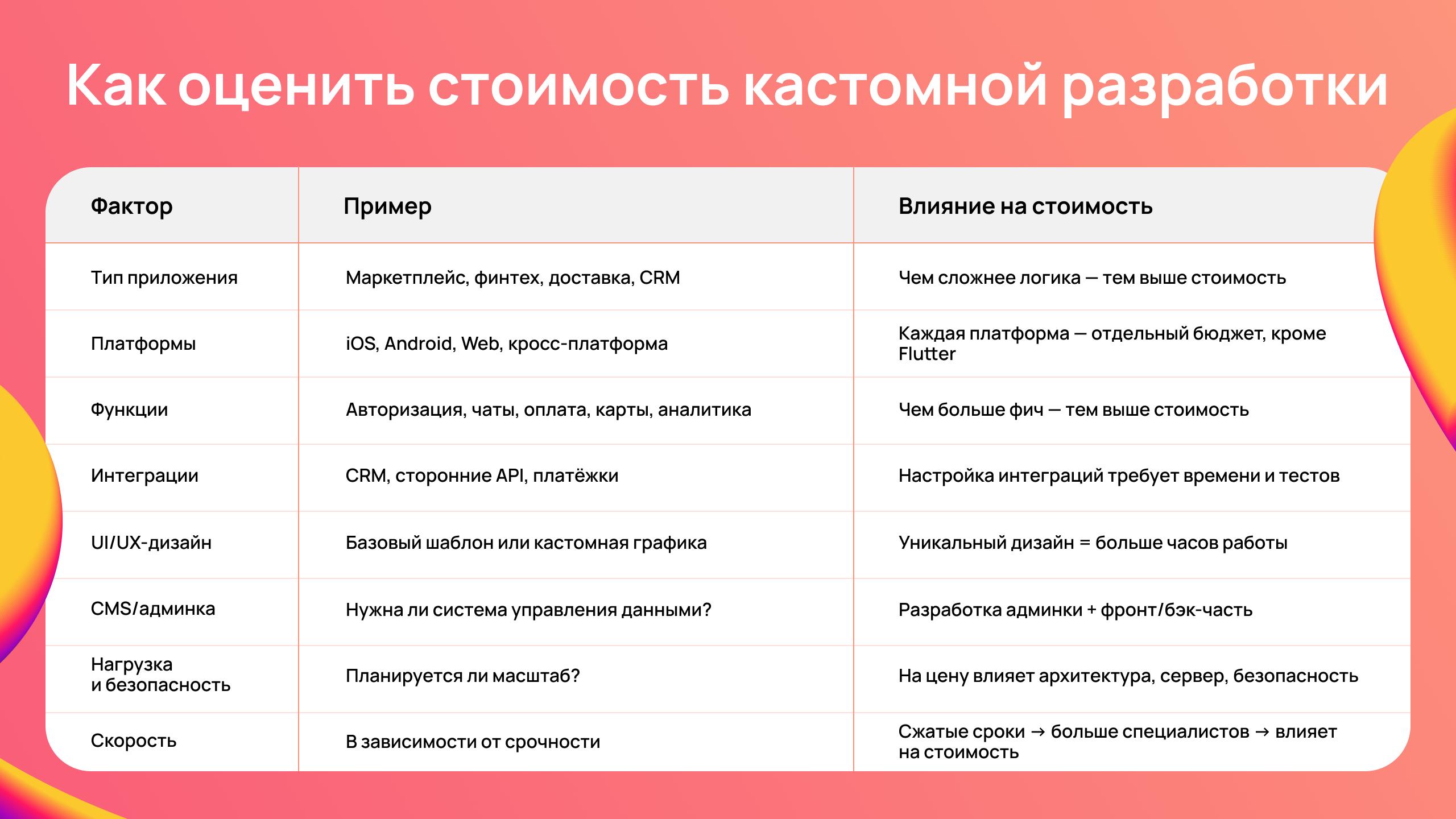 Кастомная разработка — это инвестиция. Дешево не бывает, если нужен надежный и масштабируемый продукт. Лучше всего начинать с ППО (предпроектного аудита) или архитектурной сессии, чтобы не закопаться в доработках на этапе продакшна.