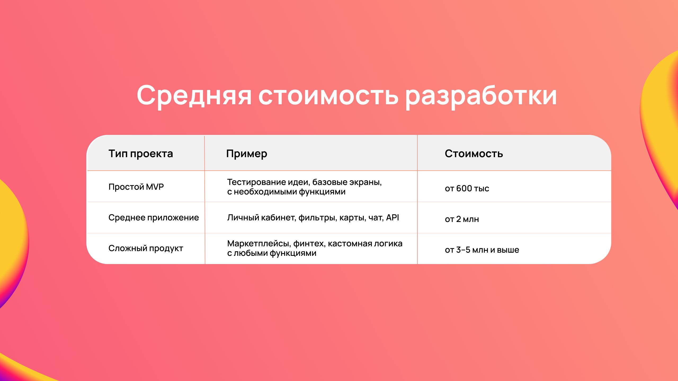 MVP — от 1,5 млн рублей. Полноценное кастомное приложение — от 3 млн и выше, в зависимости от сложности и оснащения функциями.