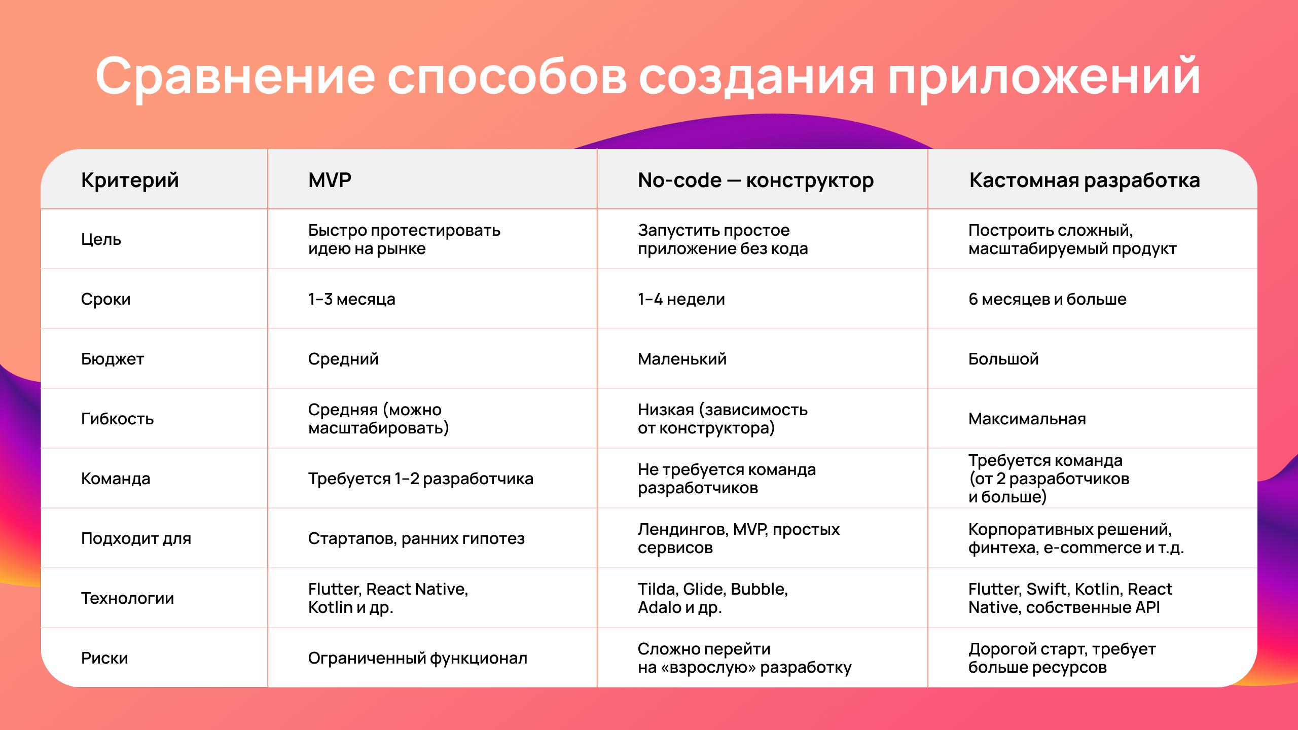 Сравнение no-code, MVP и кастомной разработки