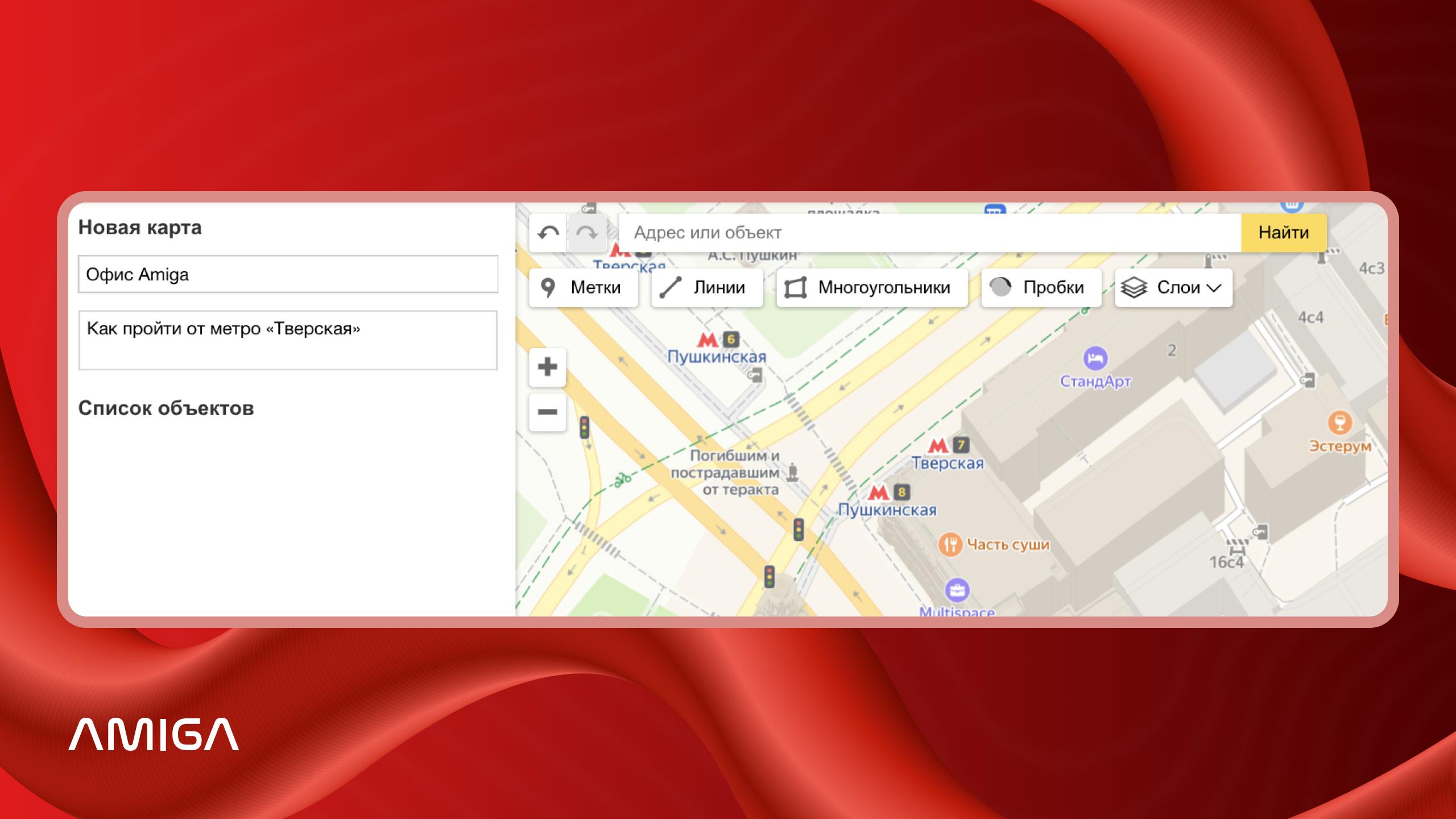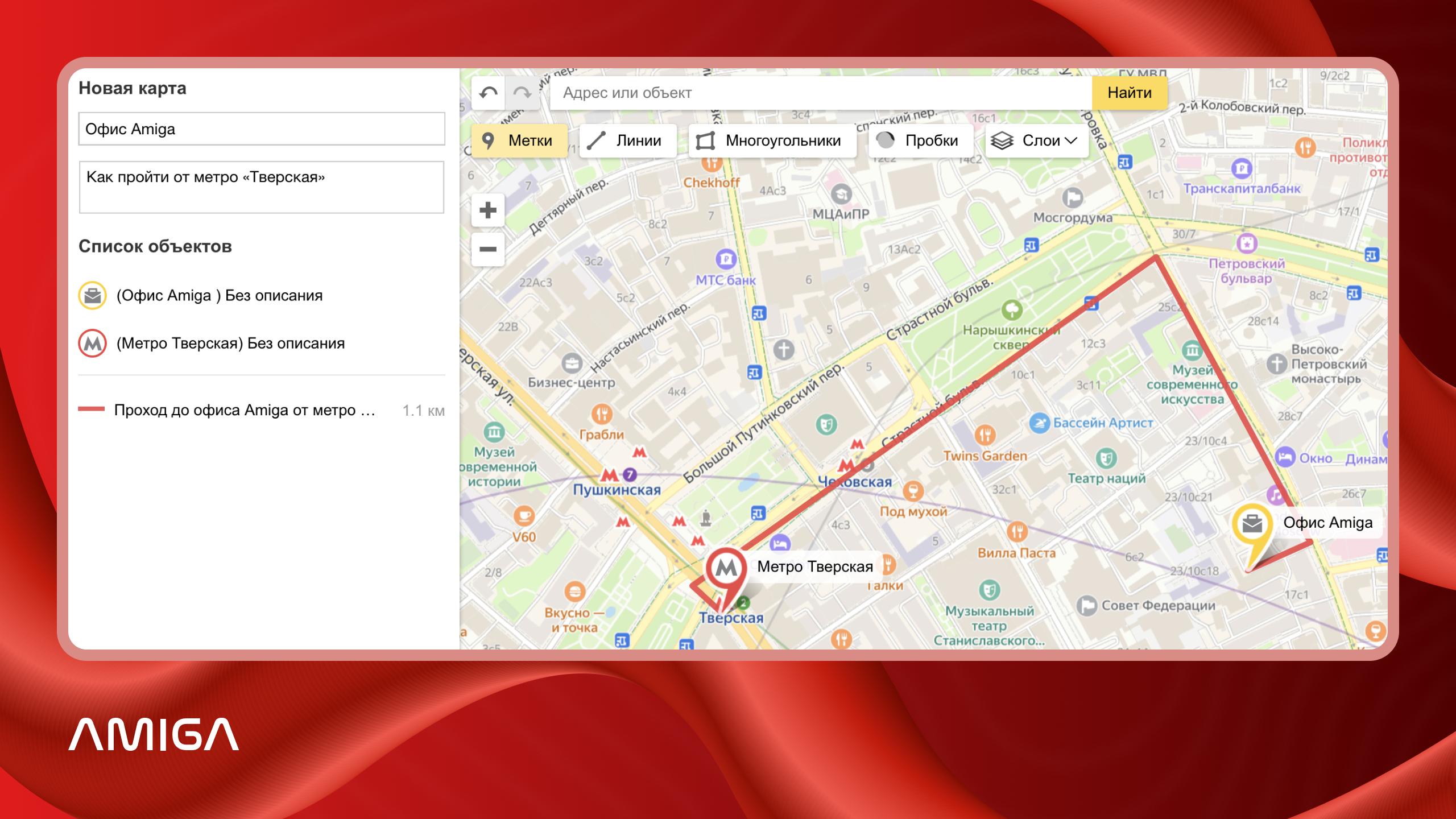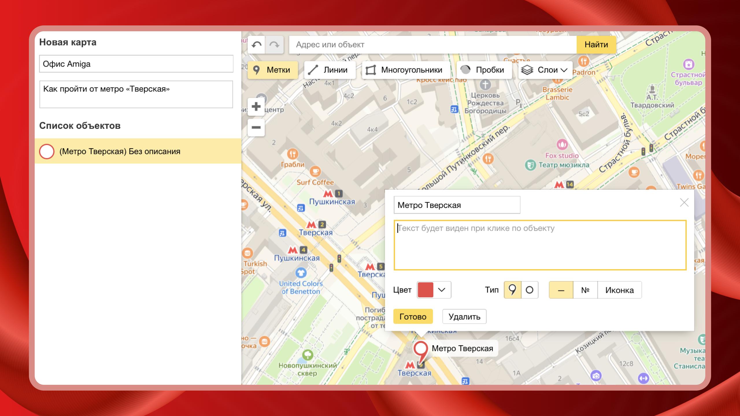 Далее увеличьте масштаб так, чтобы на экране был виден объект, от которого начинается маршрут. В нашем примере построим схему прохода от метро «Тверская» до офиса Amiga. Для установки метки кликаем левой кнопкой мыши по нужному объекту и выбираем вид, цвет и иконку для метки. Так, у нас появился первый объект.