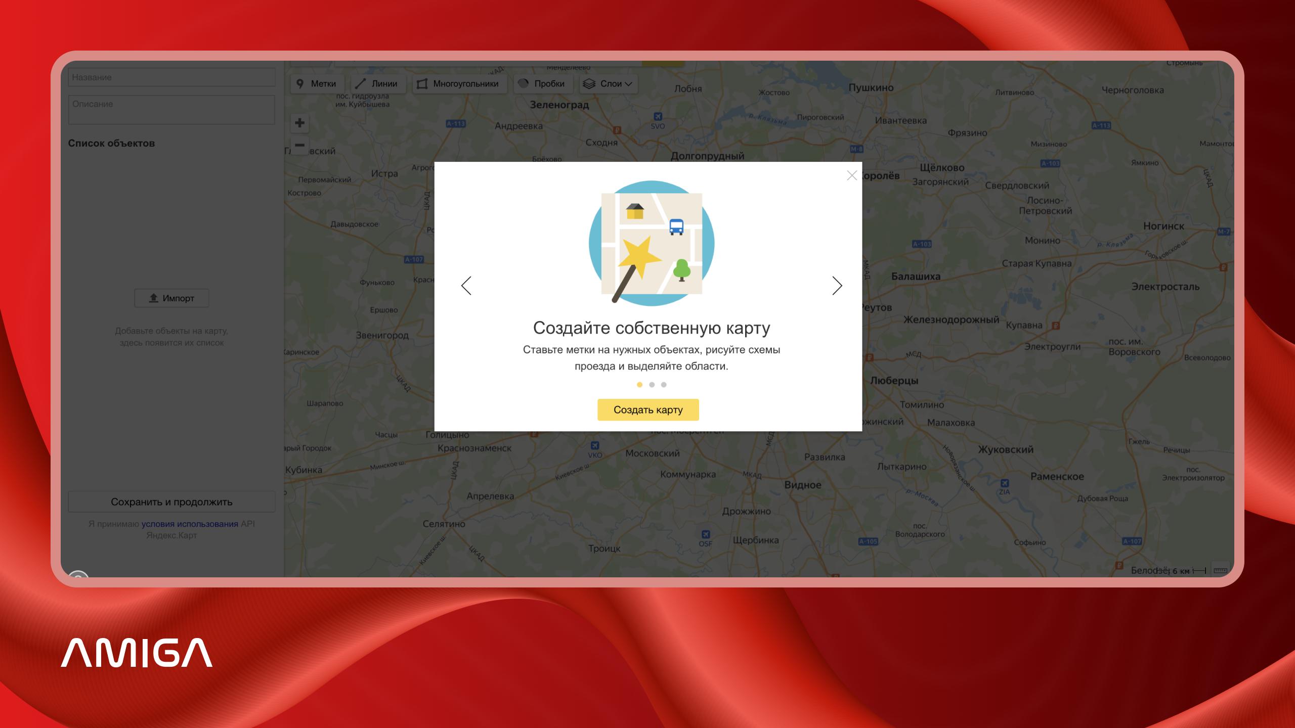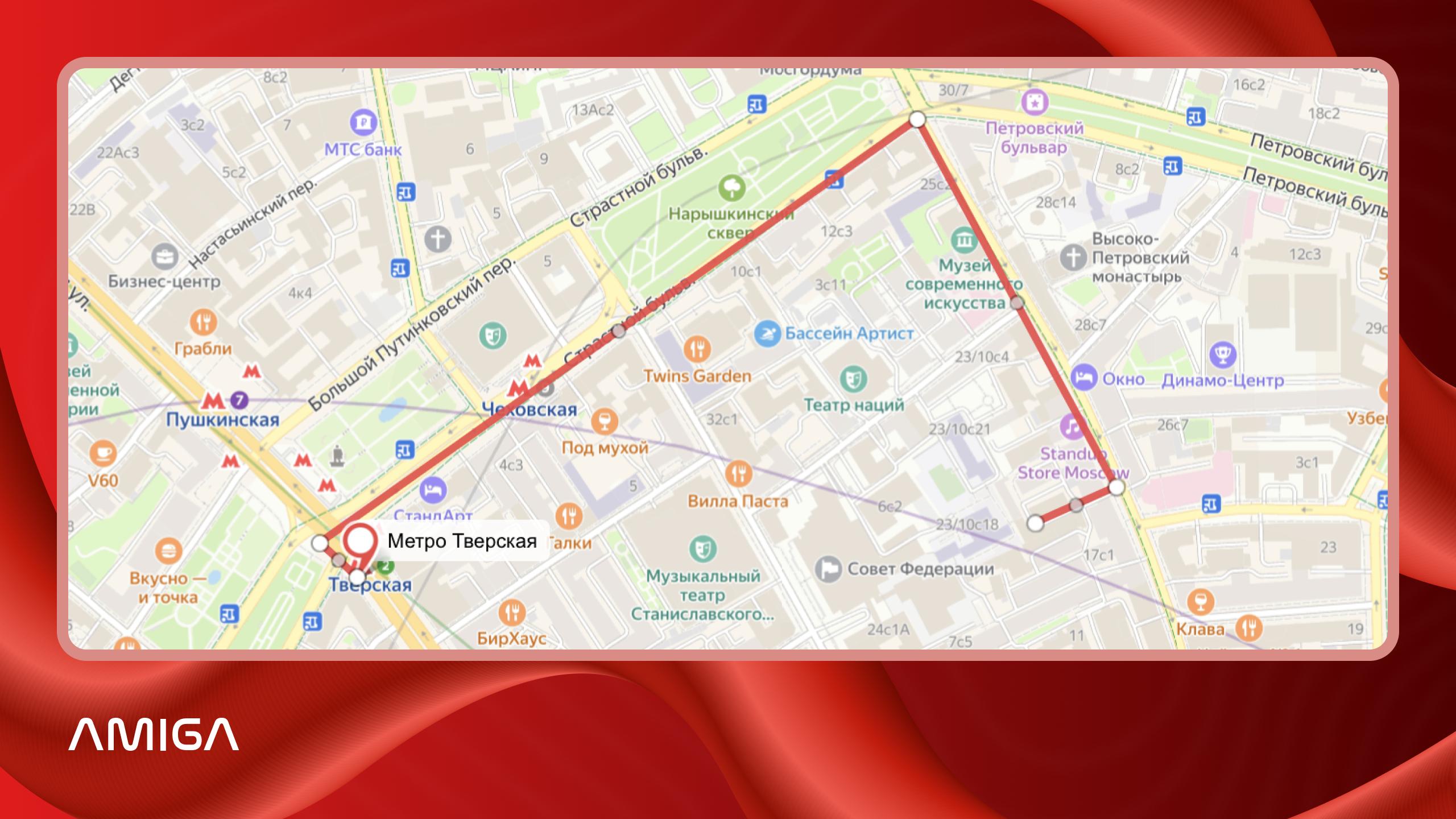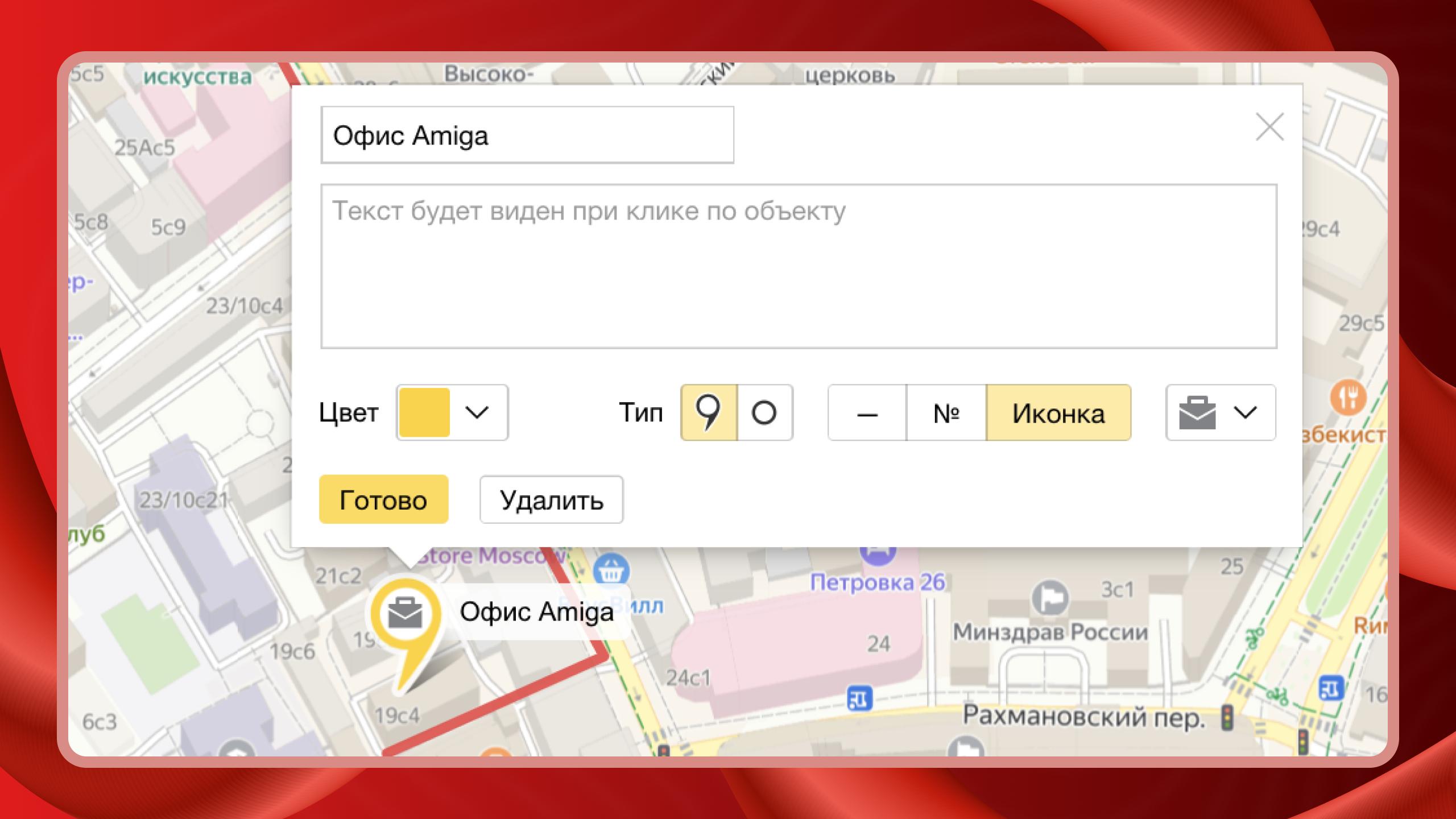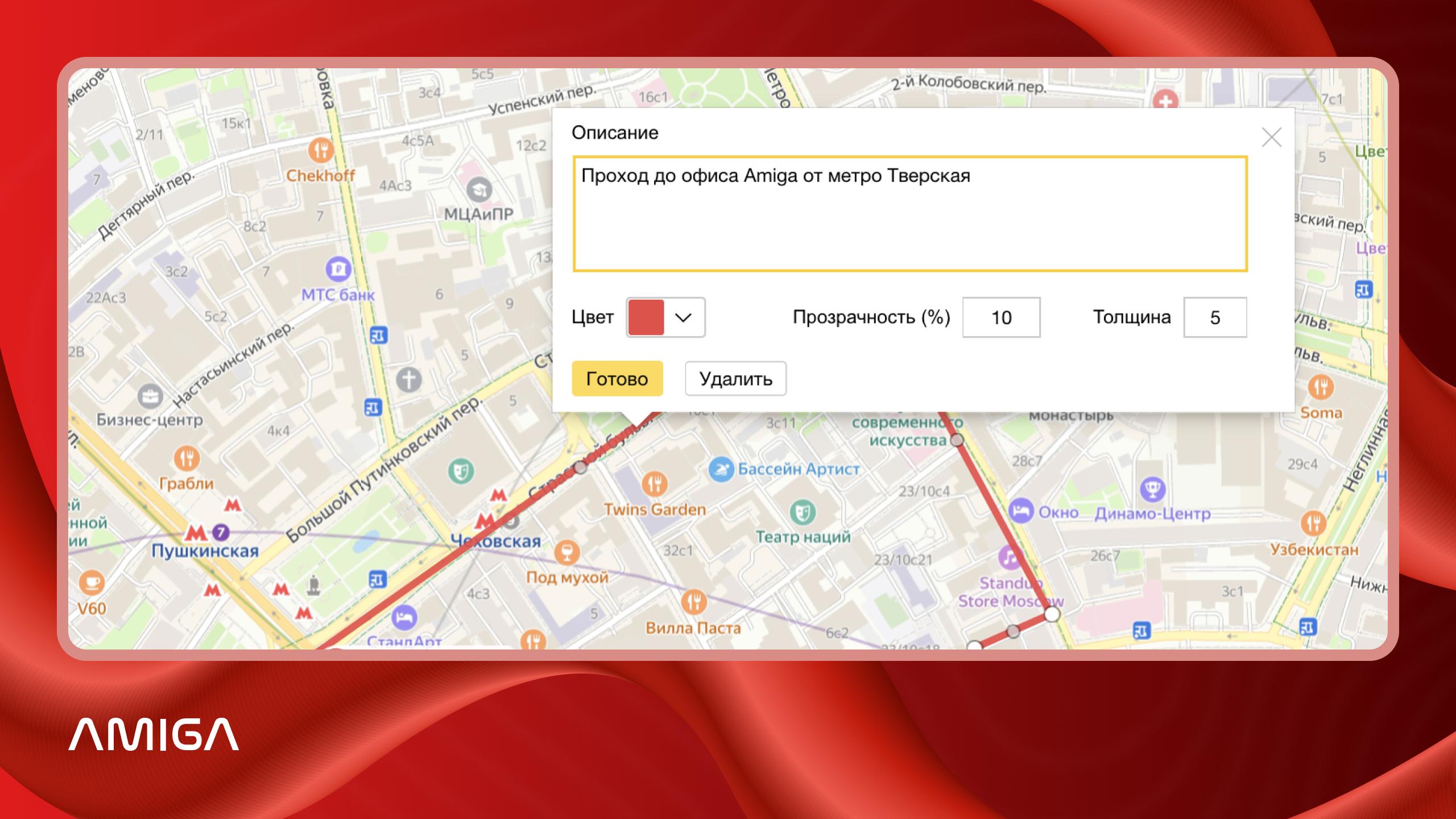 Далее увеличьте масштаб так, чтобы на экране был виден объект, от которого начинается маршрут. В нашем примере построим схему прохода от метро «Тверская» до офиса Amiga. Для установки метки кликаем левой кнопкой мыши по нужному объекту и выбираем вид, цвет и иконку для метки. Так, у нас появился первый объект.