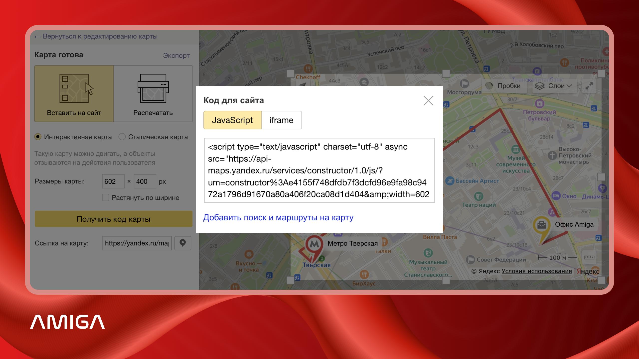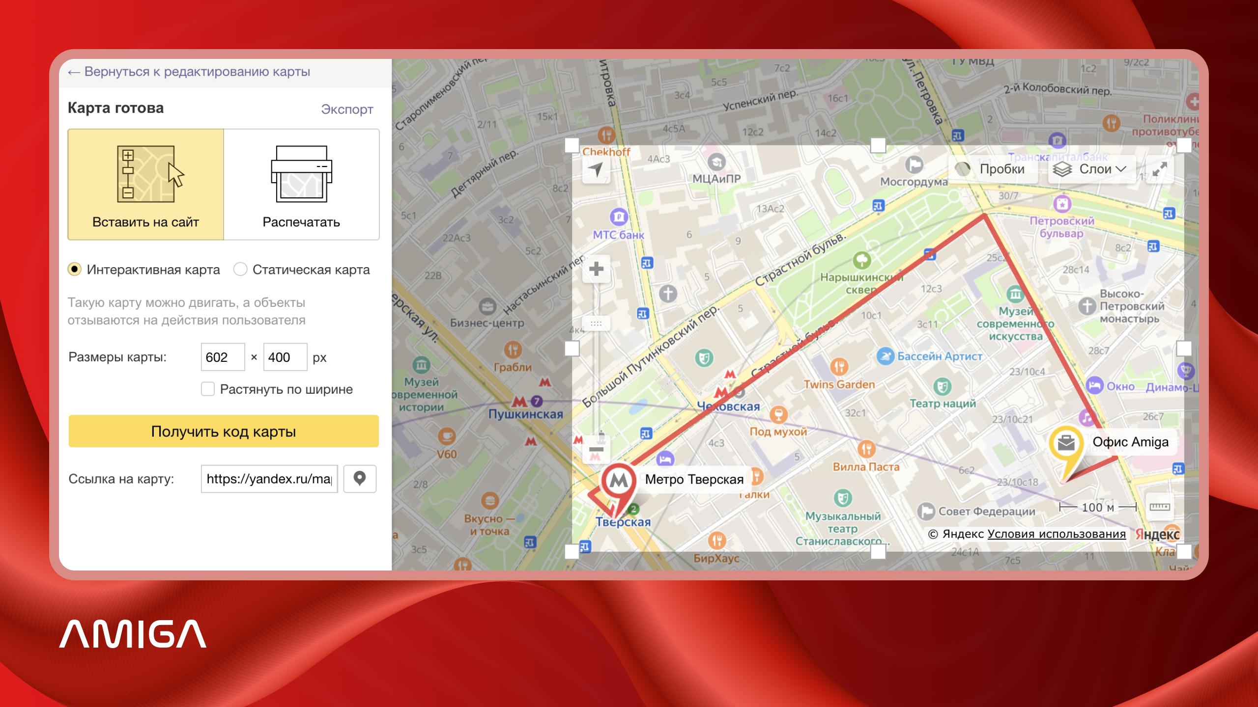 После сохранения карты доступны два варианта ее использования: интерактивный и статический. Интерактивный формат подходит для встраивания на сайт — карту можно масштабировать, перемещать и рассматривать в деталях. Статический вариант используют для печати или в ситуациях, когда у пользователя медленное интернет-соединение и интерактивная версия может загружаться некорректно.