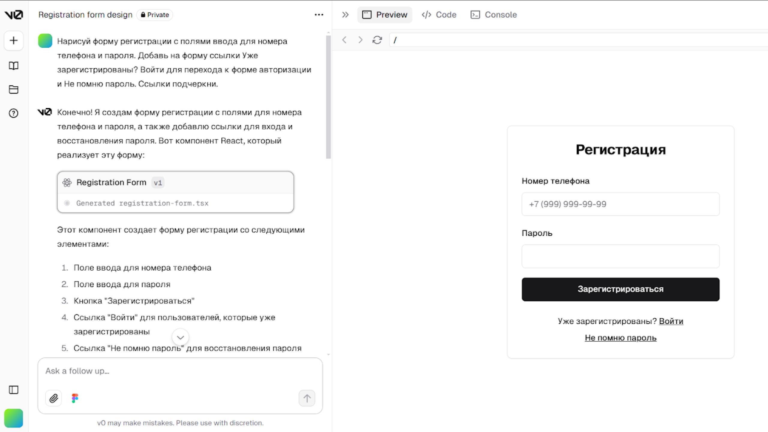 Например, вы вводите команду: «Нарисуй форму регистрации с полями ввода для номера телефона и пароля. Добавь на форму ссылки Уже зарегистрированы? Войти для перехода к форме авторизации и Не помню пароль. Ссылки подчеркни.», а v0.dev сгенерирует интерфейс, полностью готовый к использованию и дальнейшей доработке.
