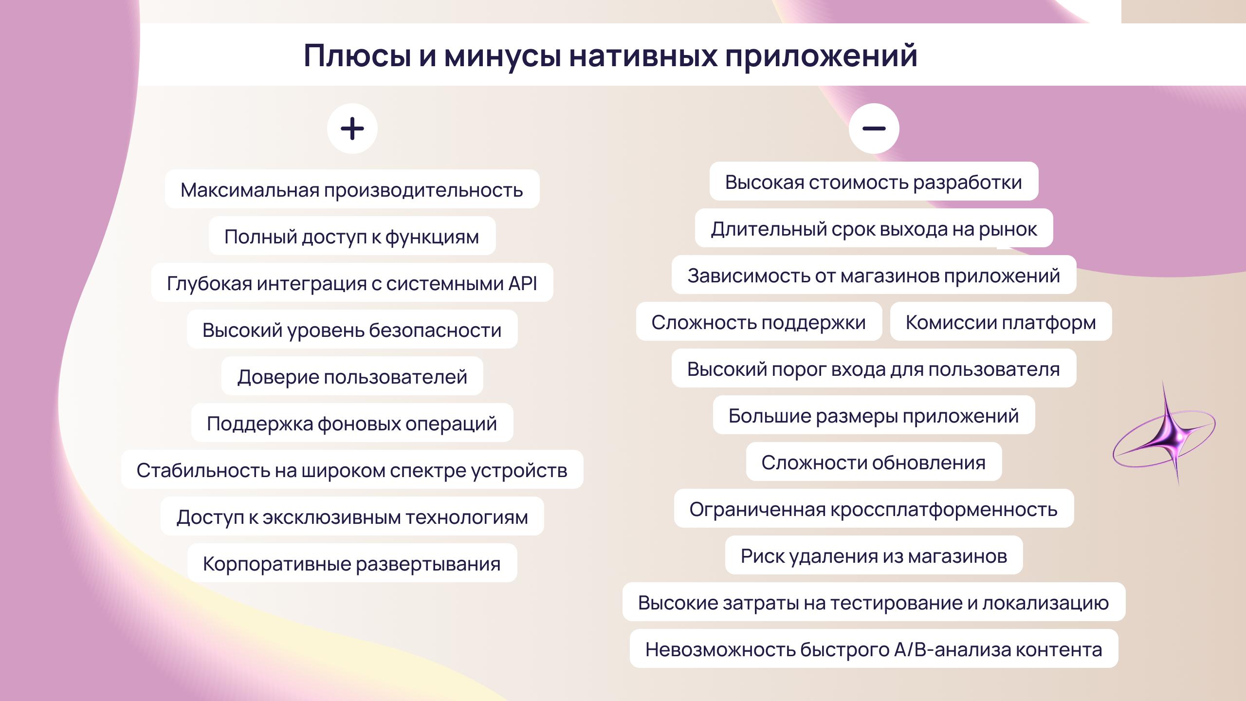 Обновления проходят через модерацию магазинов, а любые ошибки могут привести к задержкам. Кроме того, бизнес становится зависим от правил экосистемы Apple и Google, включая комиссии и ограничения. В совокупности эти ограничения делают нативные приложения менее гибкими, более дорогостоящими и медленными в развитии по сравнению с альтернативными решениями.