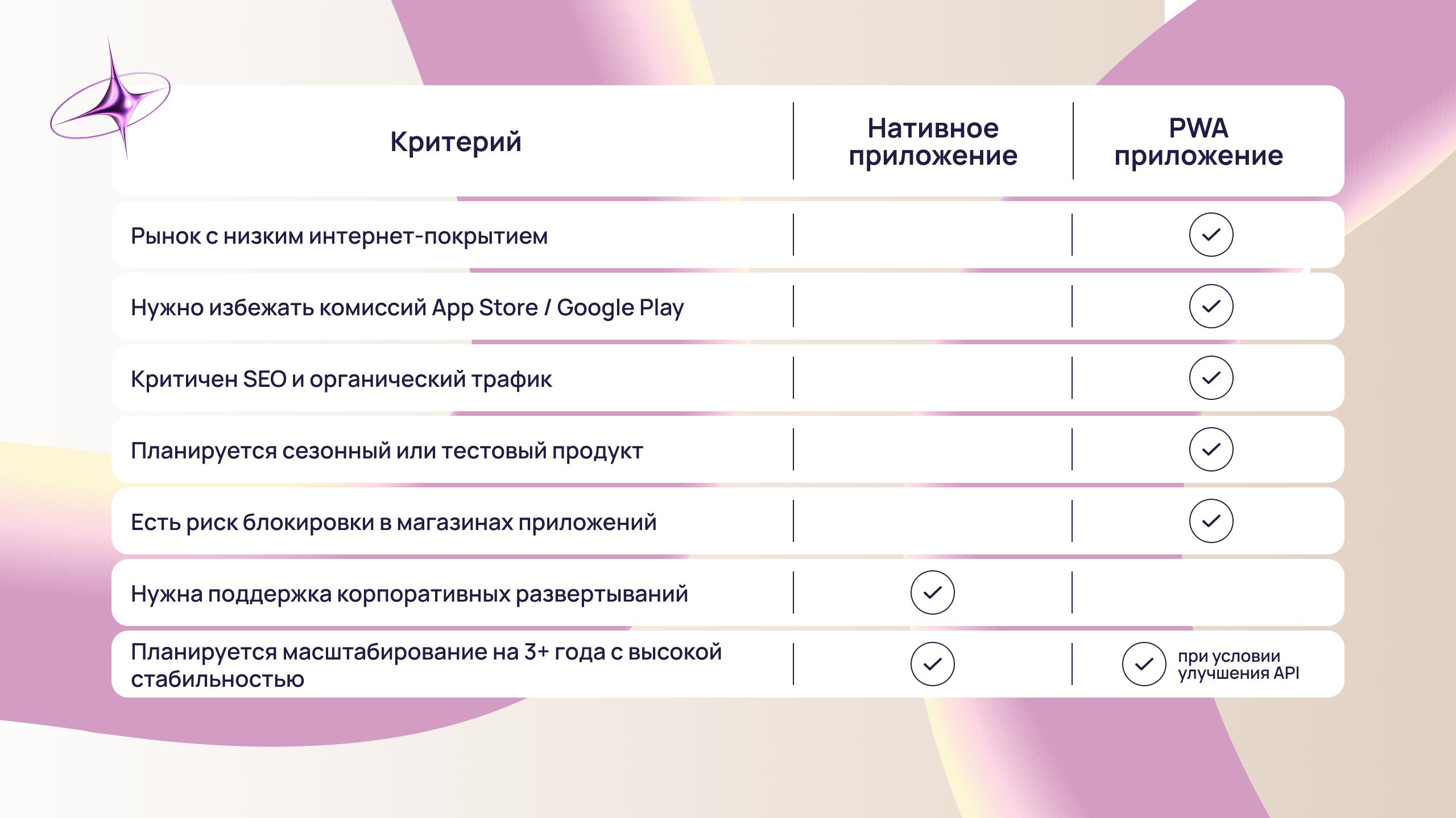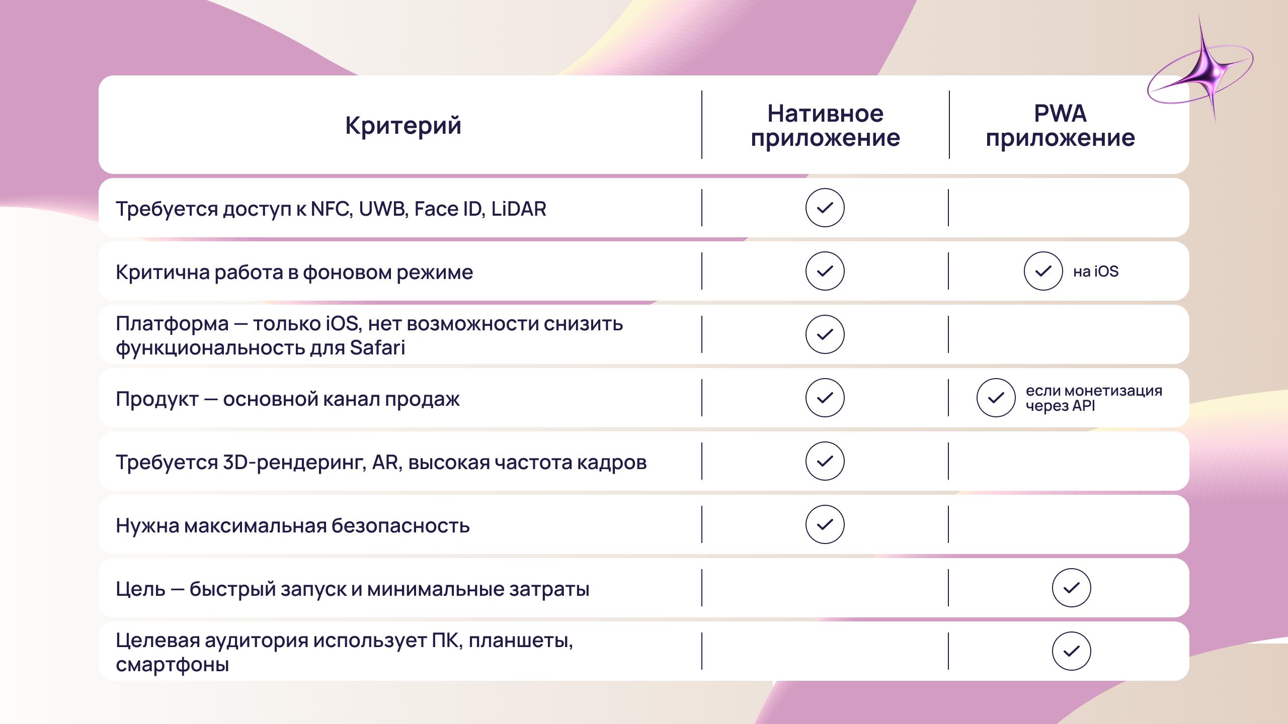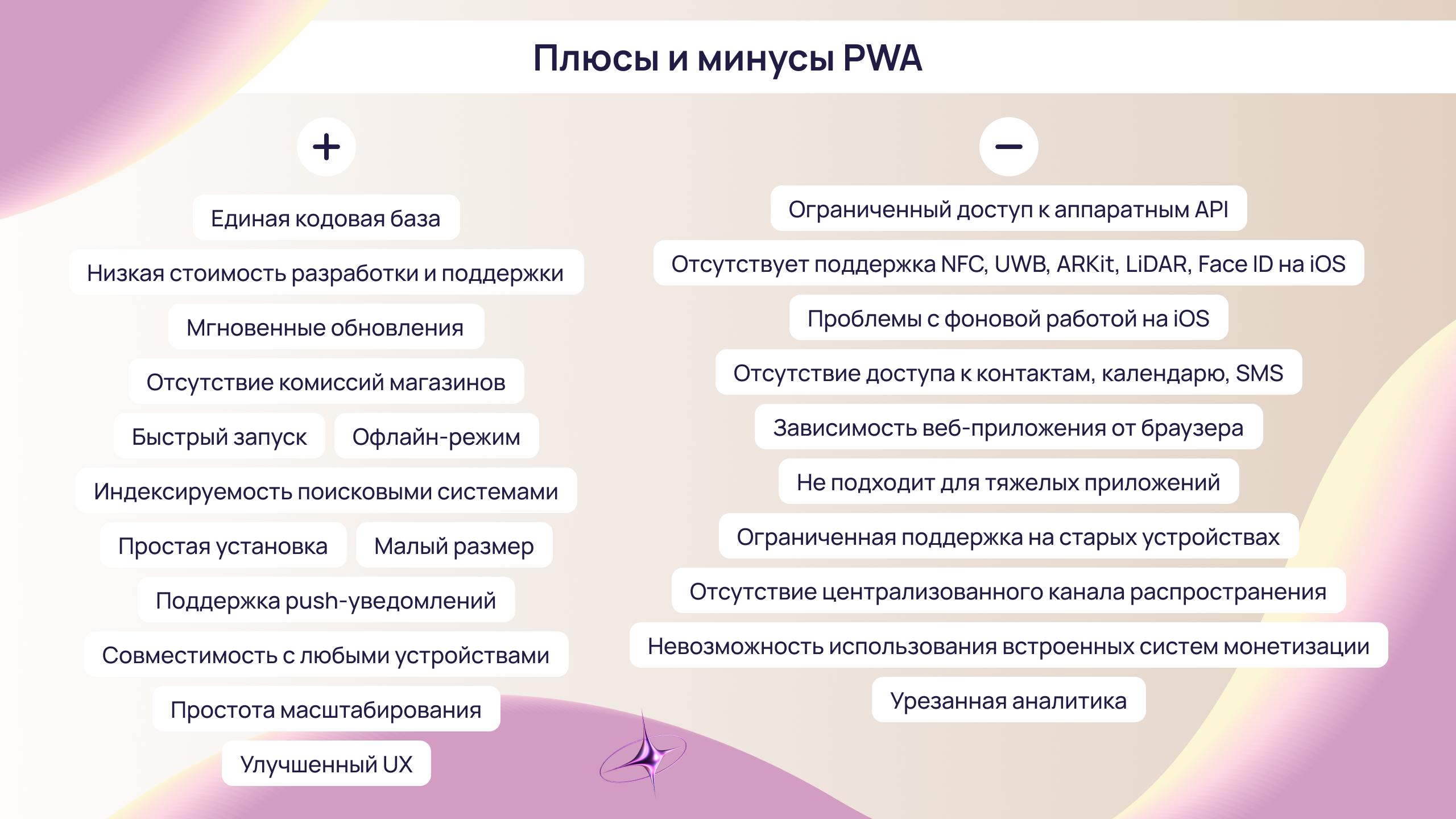 Также PWA сложнее использовать в сценариях, где требуется глубокая интеграция с устройством. В таких случаях пользовательский опыт будет уступать нативным приложениям.