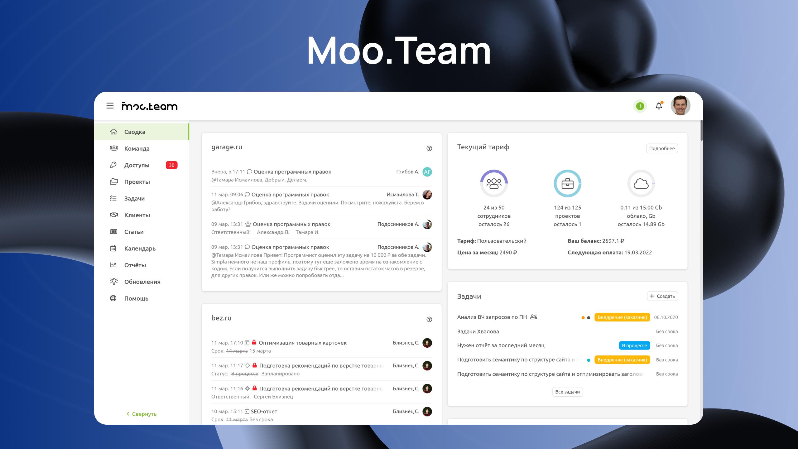 Moo.Team — легкий и понятный таск-менеджер, рассчитанный на стартапы, фрилансеров и малый бизнес. Простая логика и минимальный набор функций помогают быстро организовать работу без долгого внедрения.