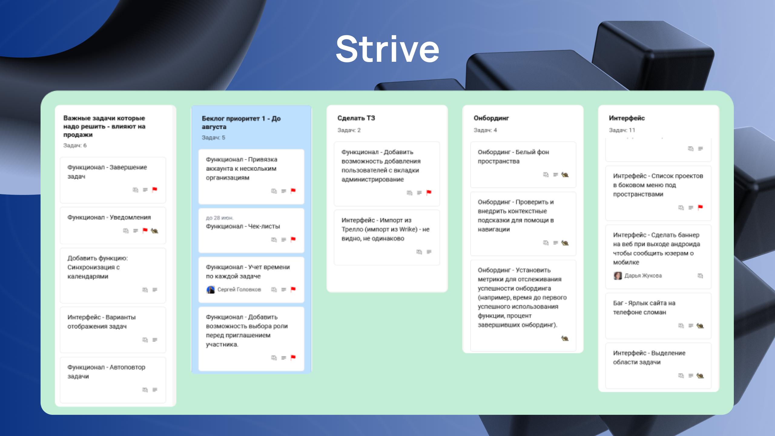Strive — лаконичный и понятный таск-менеджер, который решает ключевые задачи без лишней сложности. Интерфейс интуитивен: даже сотрудники, никогда не работавшие с подобными сервисами, разберутся за полчаса. Программа помогает структурировать задачи, вести документацию по проектам и соблюдать регламенты.