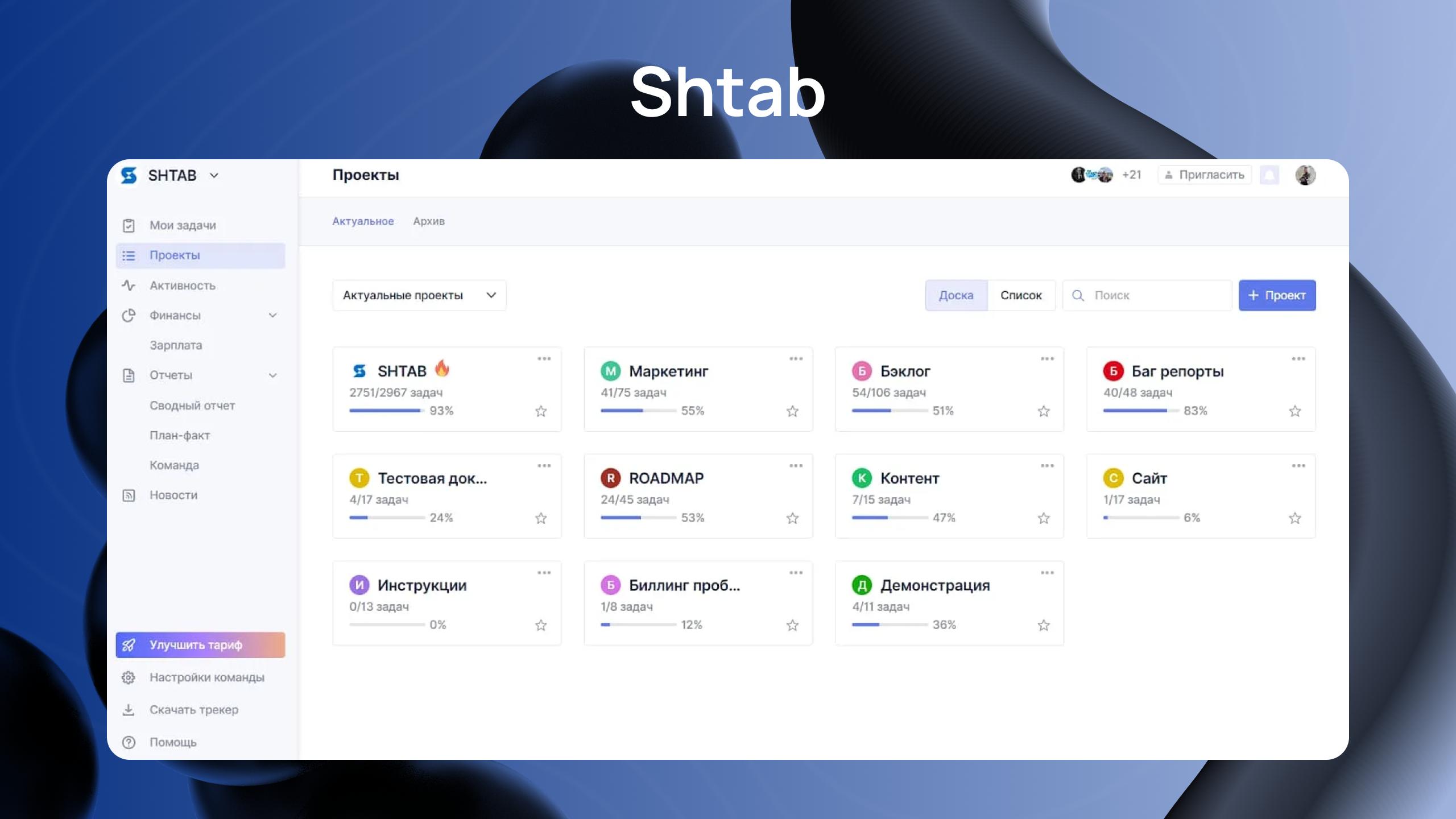 Shtab разработан для бизнеса, которому нужен четкий контроль задач внутри команды. Простая логика работы и встроенный трекер времени делают его удобным инструментом для небольших компаний.