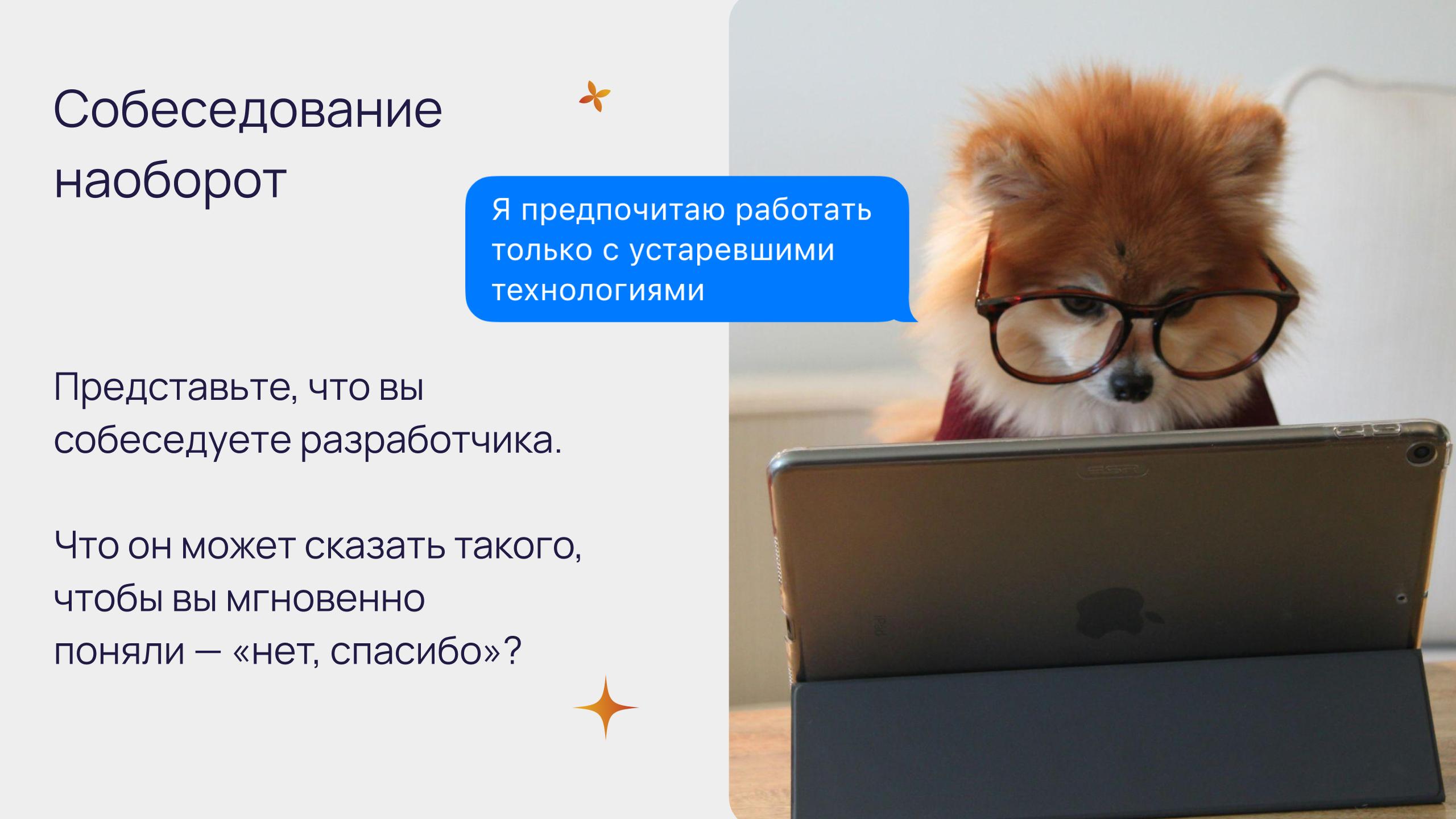 На собеседовании я смотрю не только, что человек знает, но и то, как он рассуждает, когда не знает. Если он спокойно признает пробел, предлагает, где посмотреть, и не теряется — значит, можно работать.