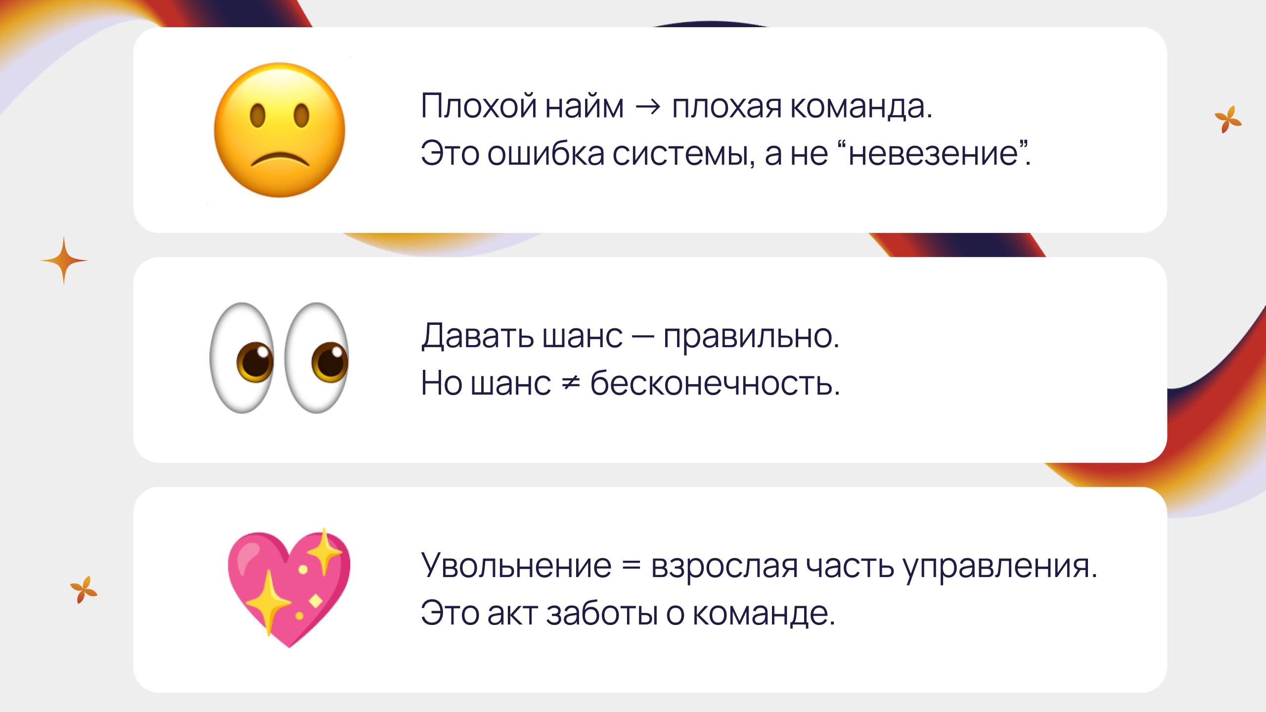 Работа над «бесполезностью» начинается еще на этапе найма — с того, как вы выбираете людей и как потом помогаете им раскрыться. Не спешите увольнять при первых недочетах: отсутствие результата не всегда значит некомпетентность. Иногда это про стресс, личные обстоятельства или перегруз. Дайте шанс: обозначьте конкретные контрольные точки, договоритесь о понятных целях, дайте честный и конструктивный фидбек. Если после поддержки и прозрачных критериев прогресса нет — значит, пришло время принять трудное, но честное решение. Главное — собрать команду, где каждый создает ценность и растет вместе с продуктом.