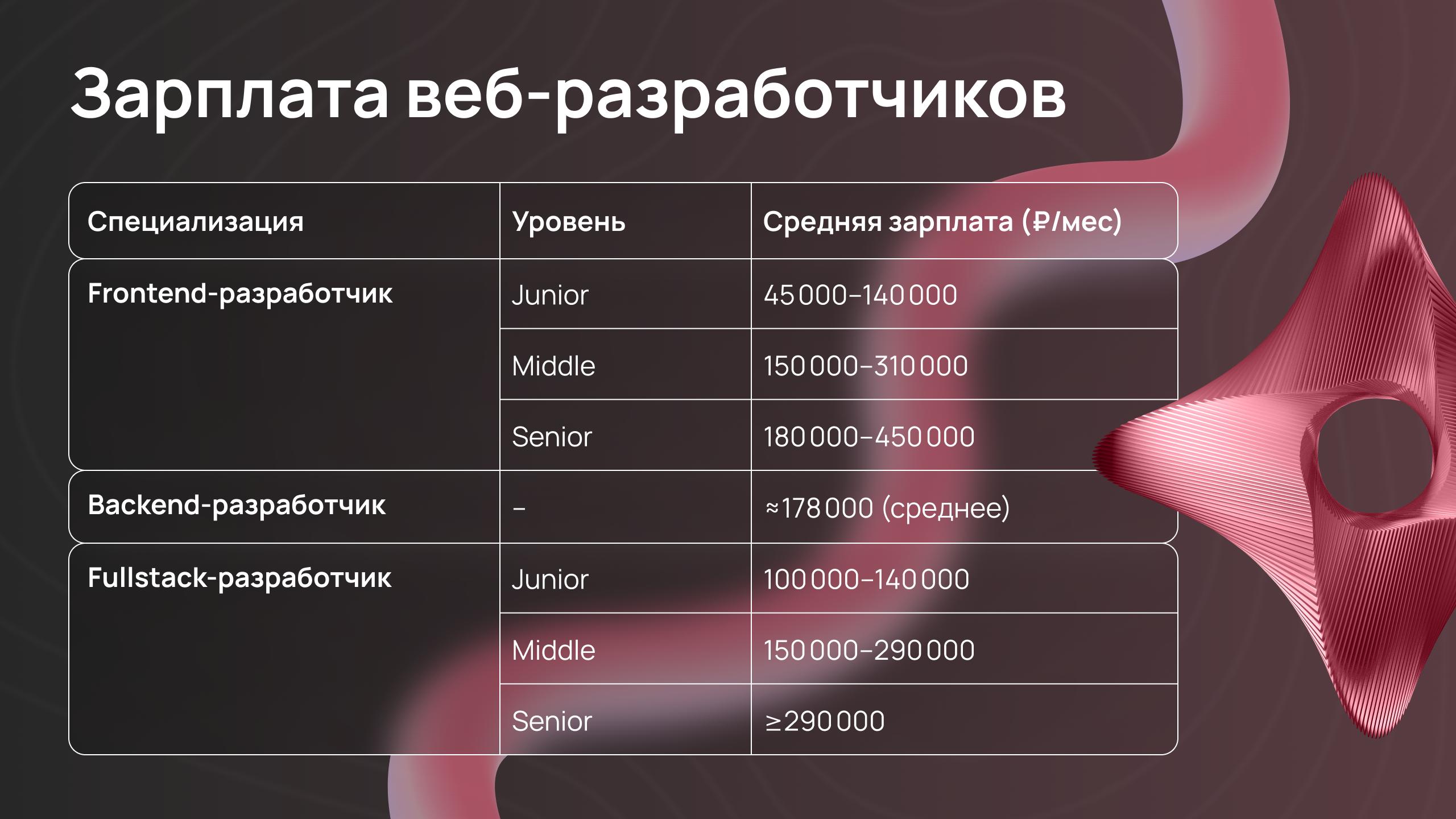 Доходы веб-разработчиков во многом зависят от места жительства и соответственно трудовой деятельности, сложности выполняемых проектов. Направление веб-разработки также имеет значение. Зарплаты веб-разработчиков в России заметно различаются в зависимости от направления и уровня опыта. У фронтенд-разработчиков в Москве диапазон может составлять от 45 000–140 000 ₽ для начинающих специалистов до 180 000–450 000 ₽ для сеньоров. Fullstack-разработчики зарабатывают чуть больше: джуны — около 100 000–140 000 ₽, мидлы — 150 000–290 000 ₽, а сеньоры — от 290 000 ₽ и выше. Средний доход backend-разработчика оценивается примерно в 178 000 ₽ в месяц, а по результатам независимых опросов — в диапазоне 220 000–270 000 ₽ (среднее около 225 000 ₽ летом 2024 года).