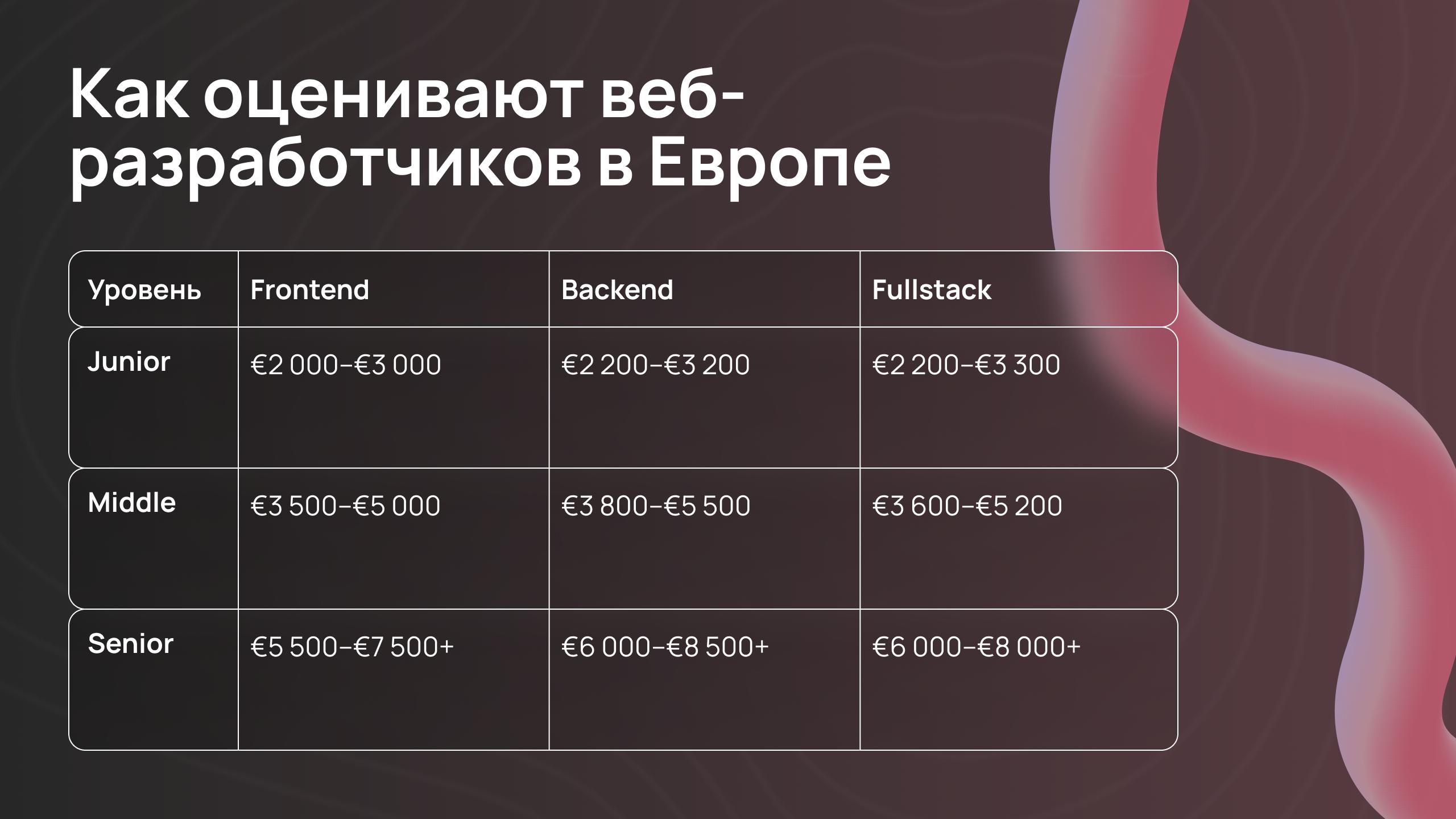 В Европе сильнее выражен разрыв между уровнями: у сеньоров зарплаты могут быть в 2–3 раза выше, чем у джунов.