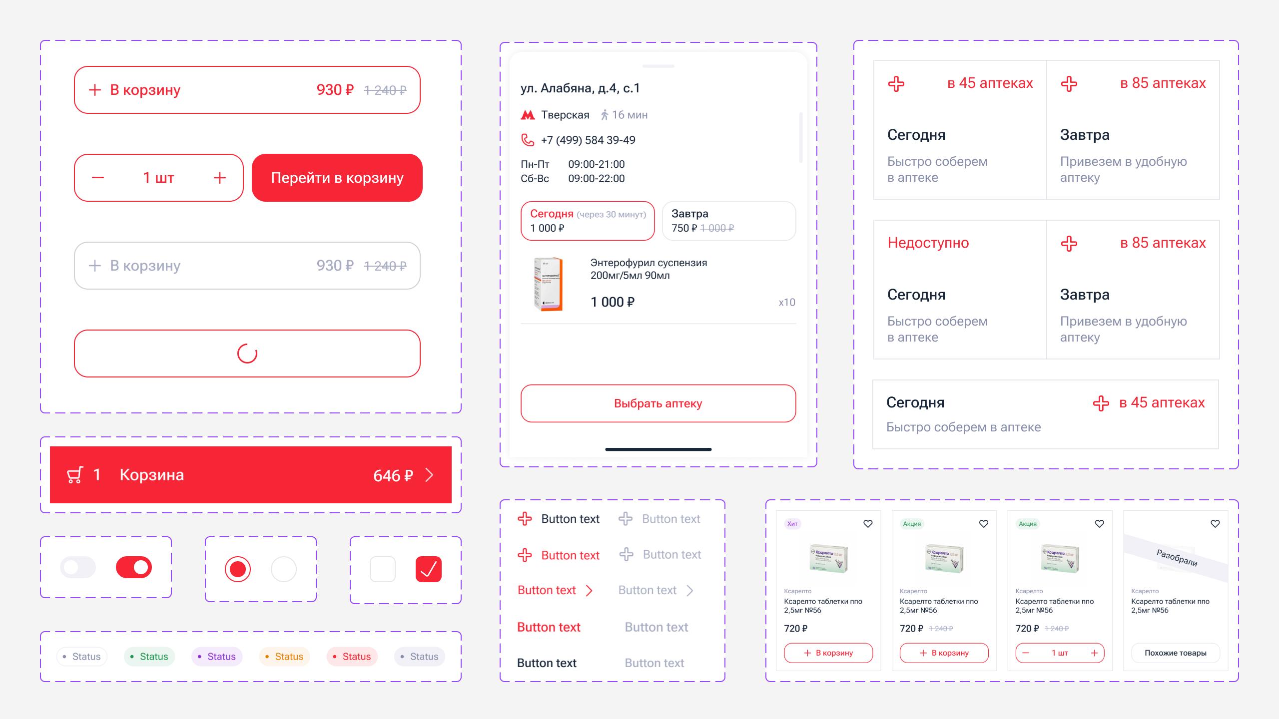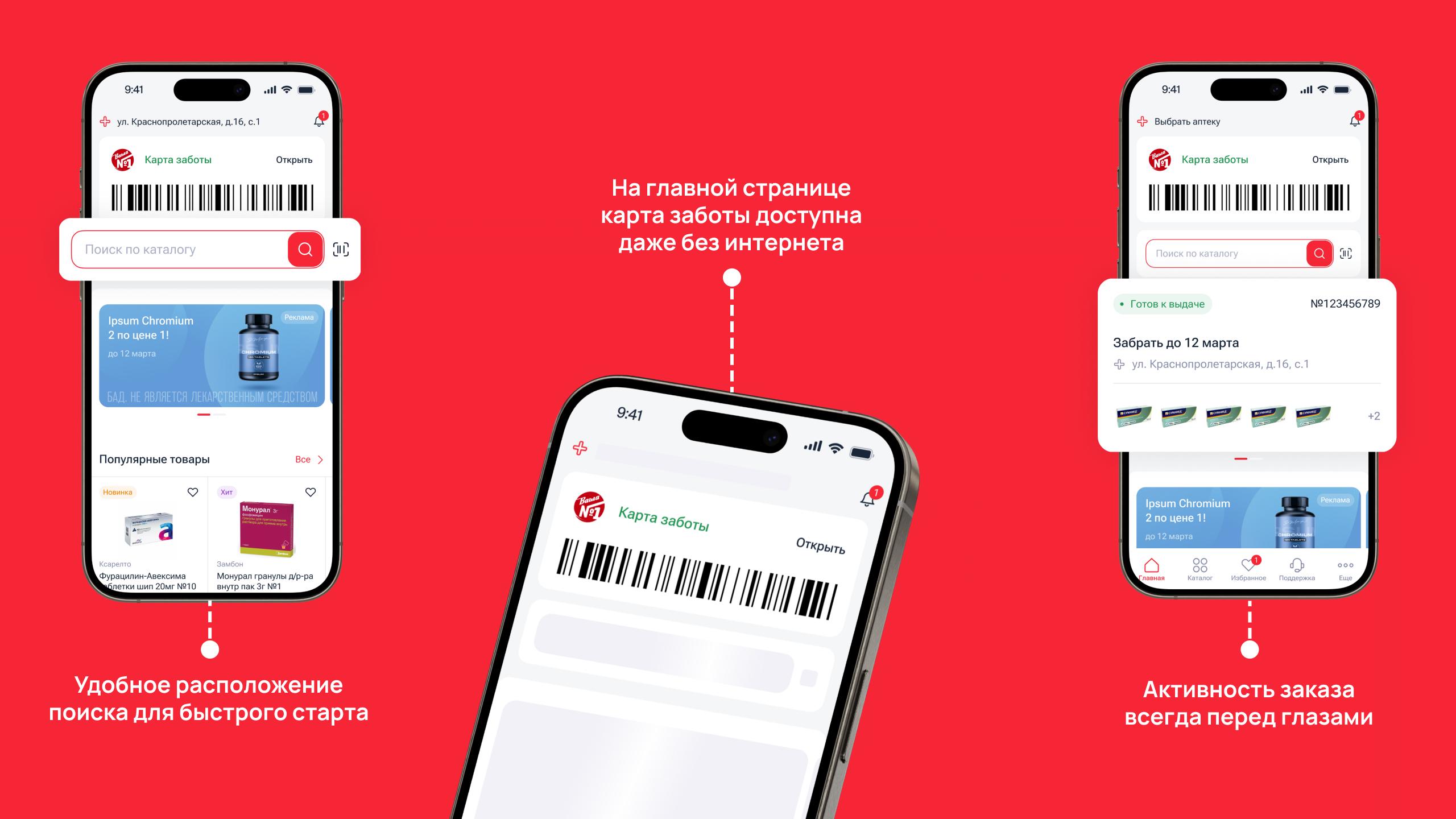 Если человек привык получать товары в конкретной аптеке, он может выбрать ее в шапке приложения, и она сохранится по умолчанию. В каталоге по выбранной точке сразу высветится наличие товаров, которые можно забрать в тот же или на следующий день. Там же можно отслеживать дату доставки. Если товар в аптеке, то его можно забрать через 30* (это стандарт качества, но время плавает как в меньшую так и большую сторону) минут, а если доставка со склада, то товар будет доступен на следующий день, кроме выходных и праздников.