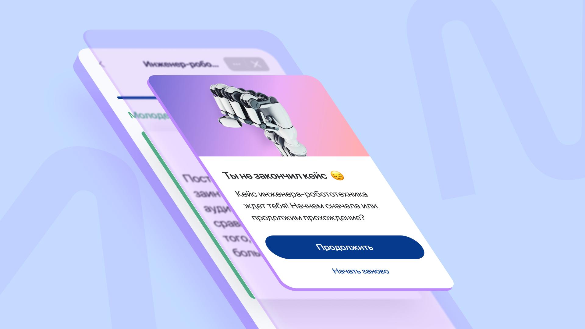 Если пользователь начал проходить кейс, но не закончил, то при следующем открытии детальной страницы кейса появится модальное окно с предложением продолжить прохождение на том моменте, где пользователь остановился, либо начать заново.