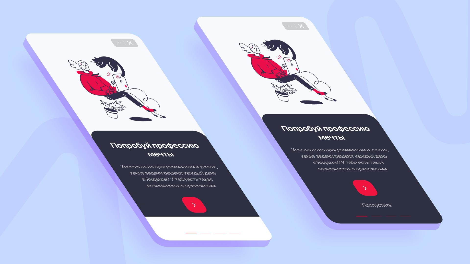 Онбординг показывается только 1 раз при запуске приложения и служит помощником для знакомства с его миссией. Далее пользователь попадает на экран со списком кейсов по направлениям: AI, кинопродюсер, PM, робототехника и другие.