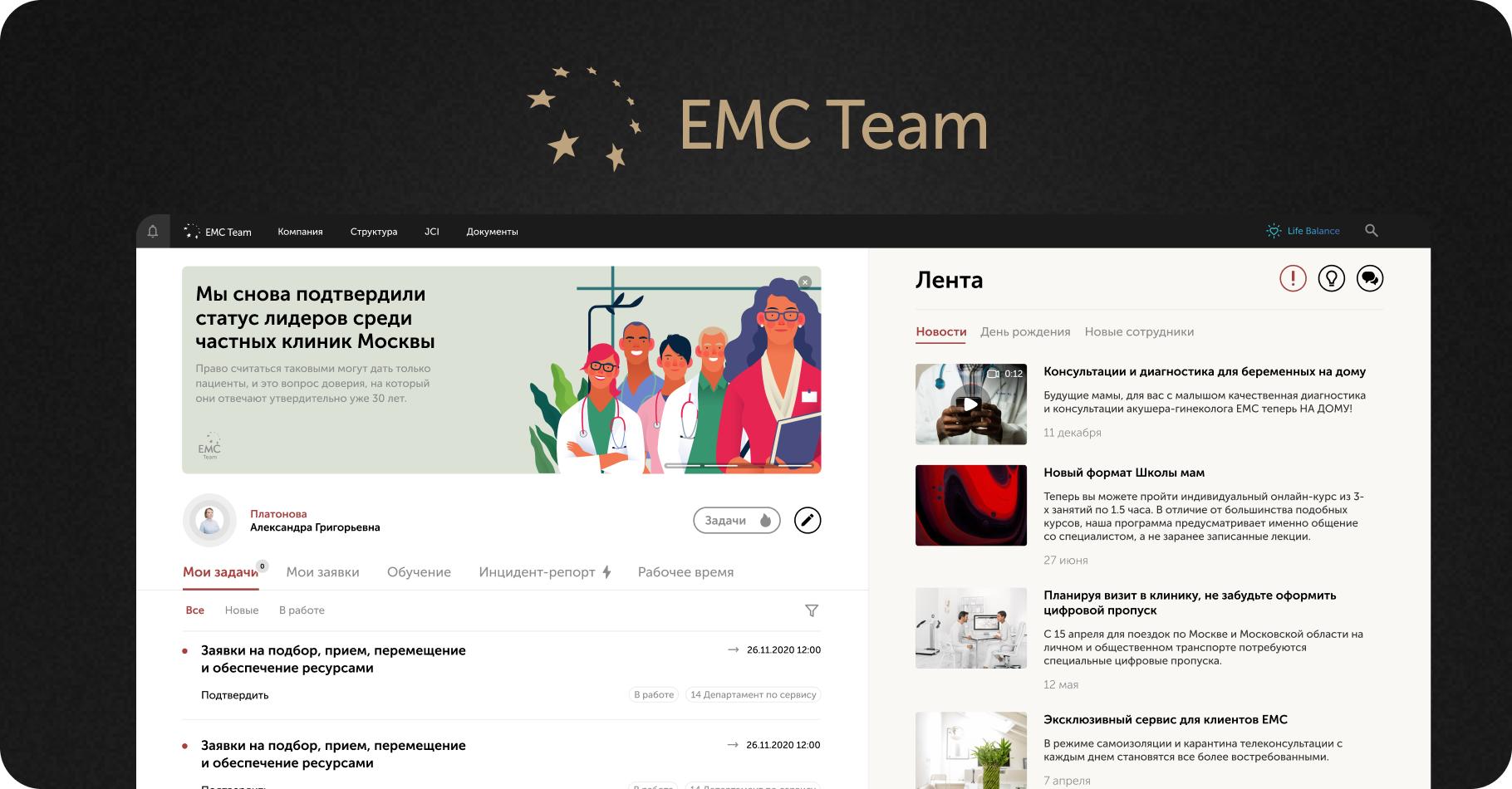 К нам с запросом на технические доработки пришли EMC Team. У медицинского центра уже был корпоративный портал — это единая точка входа для всех систем. Он интегрирован со всеми необходимыми платформами. При любом запросе сотрудник в первую очередь зайдет на корпоративный сайт.
