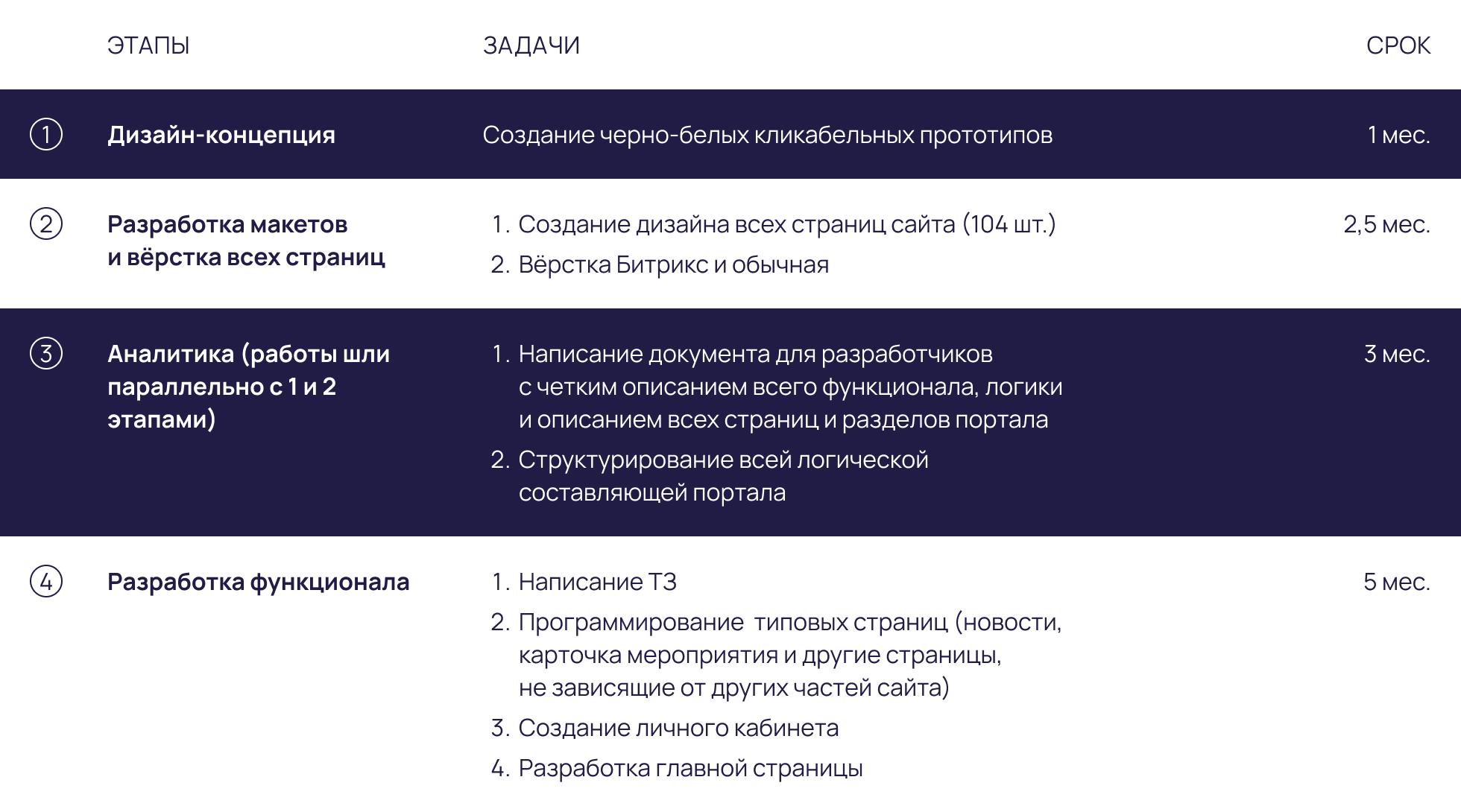В рамках проекта мы задокументировали все этапы реализации и придерживались четко обозначенных сроков — весь портал необходимо было разработать за 8 месяцев.