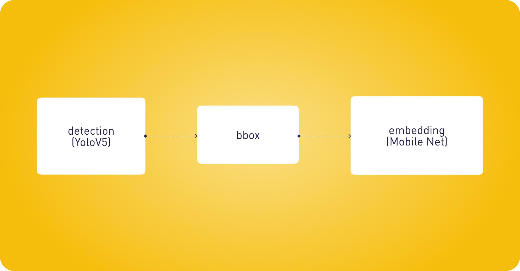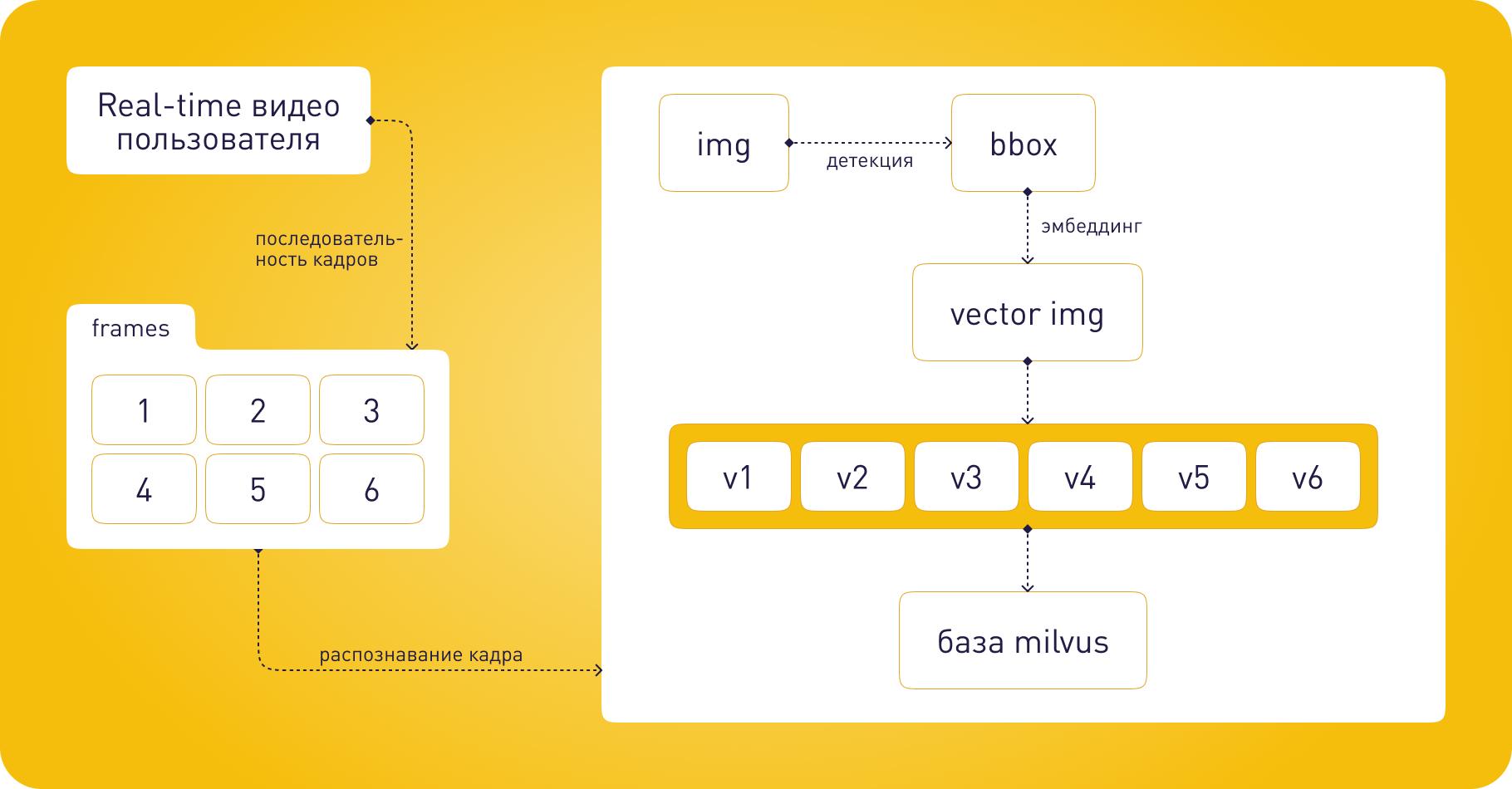 С точки зрения пользователя ML-модель работает так: пользователь снимает видеопоток на смартфон, детектор находит монитор в его окружении, преобразует показываемый видеопоток из монитора в численный вектор. Каждые 6 кадров по полученной последовательности числовых векторов происходит поиск шаблонного вектора. Когда нужный вектор найден, определяется видеопоток и пользователь узнает, откуда это видео, и какие в нем товары присутствуют