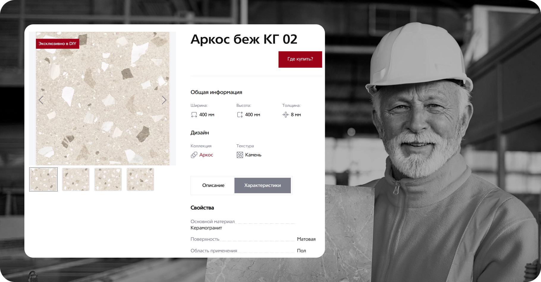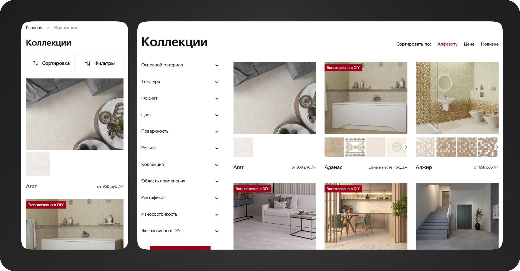 Разработка каталога коллекций была одним из самых важных этапов проекта. Это классический каталог без корзины с динамичным, подробным и удобным фильтром. Механизм его работы простой: пользователь фильтруется по характеристикам плит и получает коллекции, в которых они есть. Таким образом, сразу появляются готовые интерьерные решения, которыми можно вдохновиться и реализовать. Мы также включили функцию поиска, которая помогает B2B и B2C клиентам быстро находить и выбирать для себя подходящие варианты облицовочной плитки, керамогранита, ступеней, декора и бордюров.