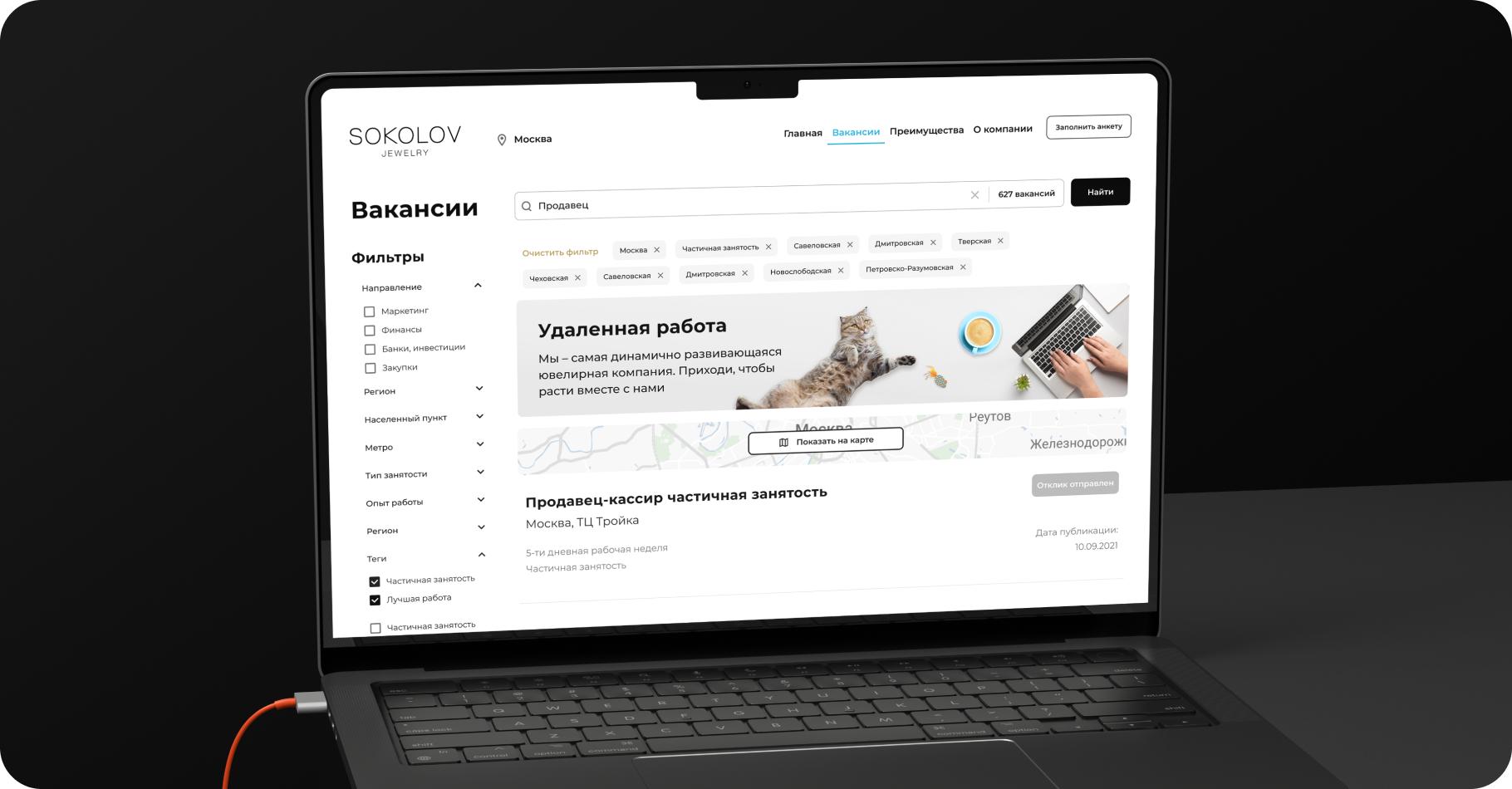 Разработать платформу для привлечения сотрудников разных специализаций. Сделать так, чтобы найти работу в SOKOLOV смог каждый. Помочь соискателям подобрать подходящие вакансии для своего региона и опыта работы.