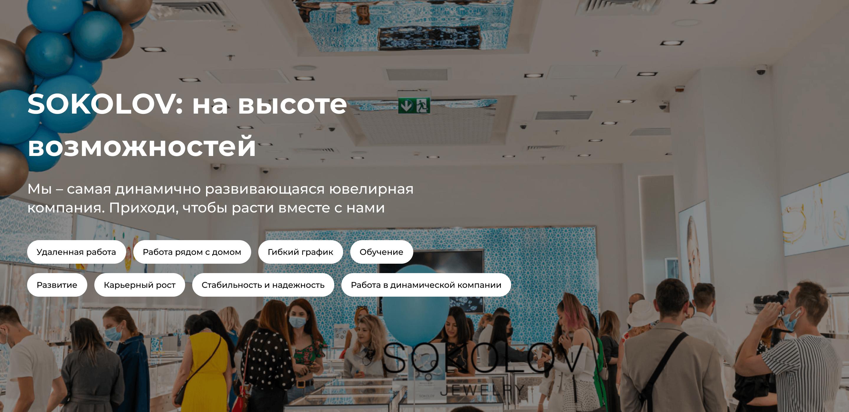 На главной странице — основная информация о достижениях SOKOLOV как надежного работодателя. Компания заботится о своих сотрудниках и стремится помогать им в карьерном росте.