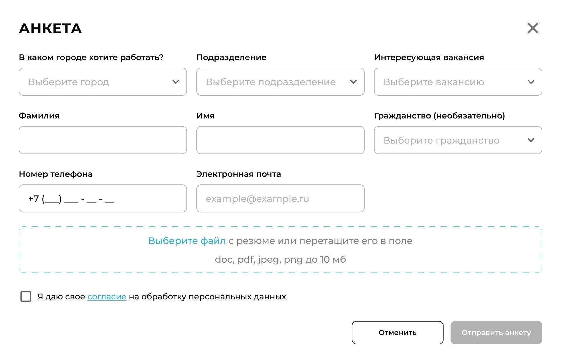 Добавили анкету для заявок, чтобы кандидат сразу отправил свое резюме, если рассматривает для себя несколько позиций и хочет пройти собеседование без конкретной вакансии.