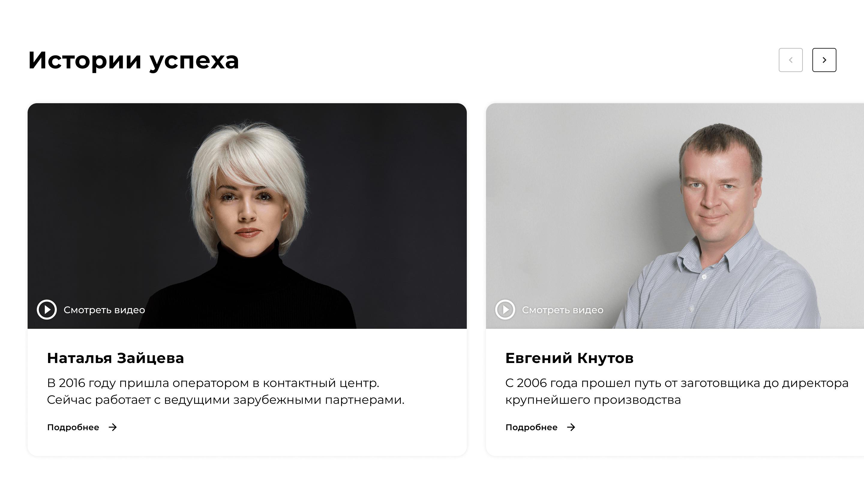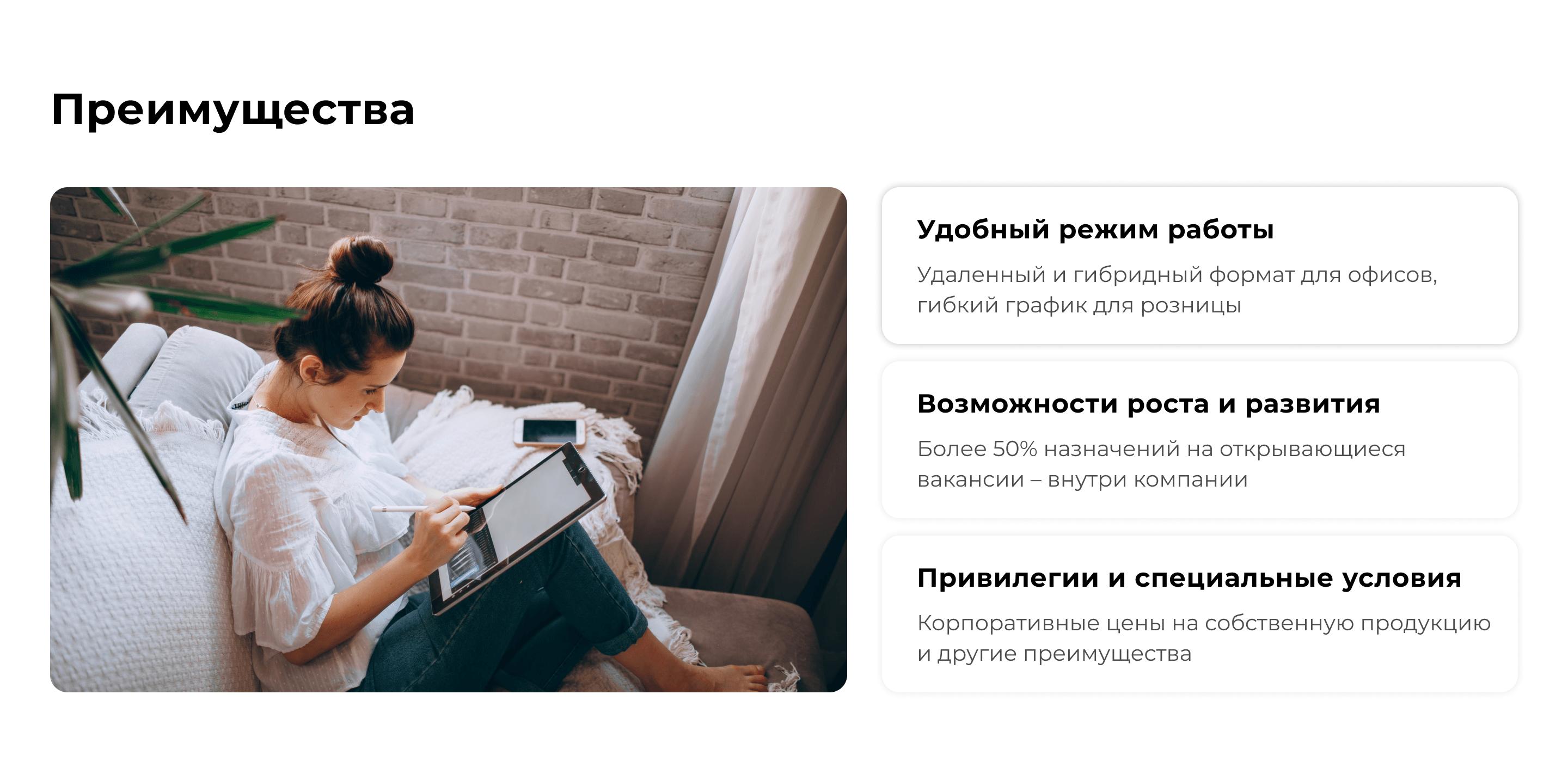 Добавили блок с реальными кейсами сотрудников, которые уже добились карьерных успехов и могут на пальцах рассказать, как это — работать в SOKOLOV. Он отображается на главной странице и дублируется на странице «Преимущества» и дает возможность соискателю увидеть реальные кейсы роста и развития сотрудников в компании.