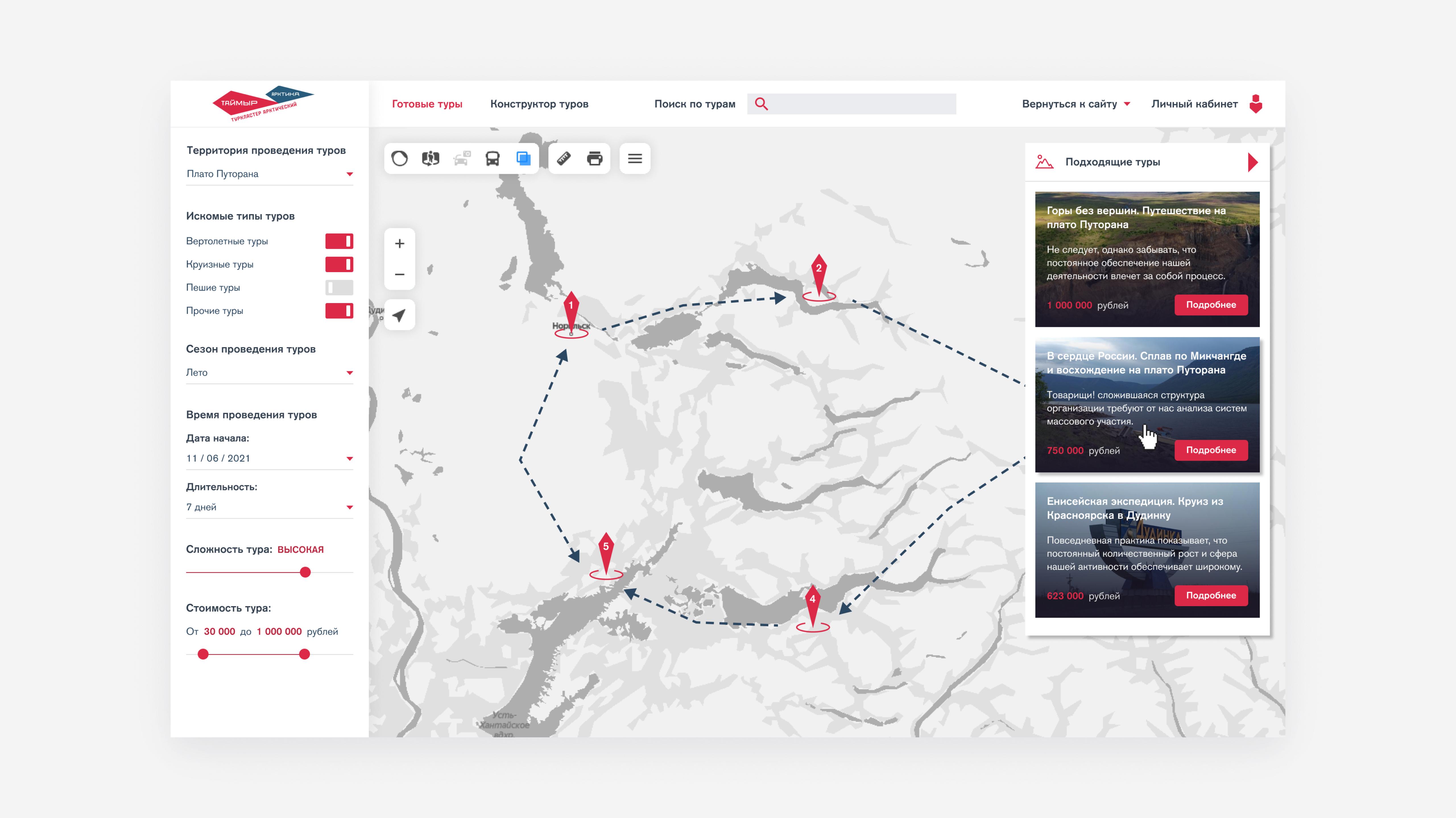 Конструктор путешествий — это фишка на сайте Таймыра, где прямо на карте можно выделить локации и построить к ним маршрут или объединить несколько мест в одно путешествие.