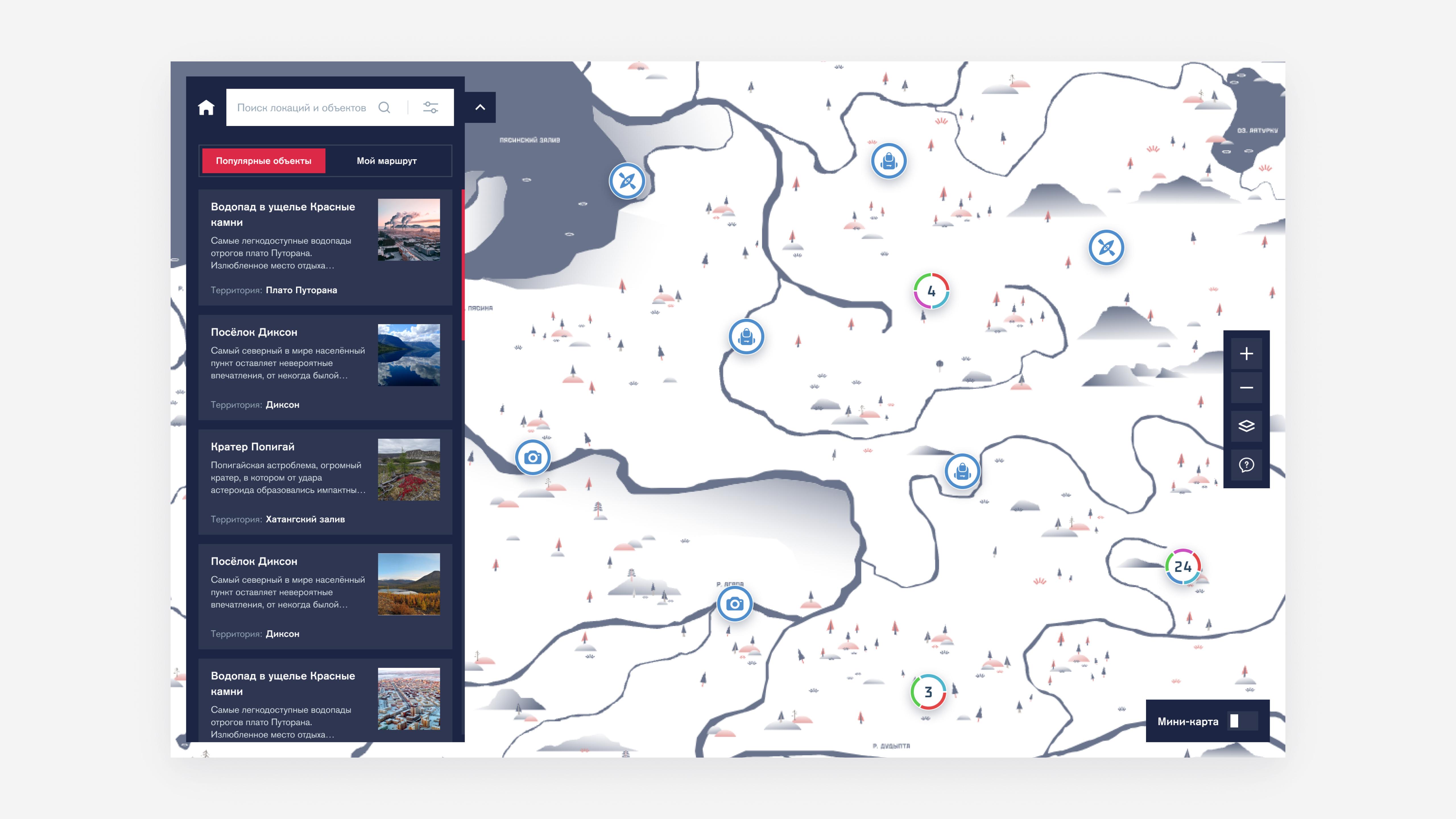 Знакомит пользователей с Таймыром через контент и карту ключевых туристических локаций;