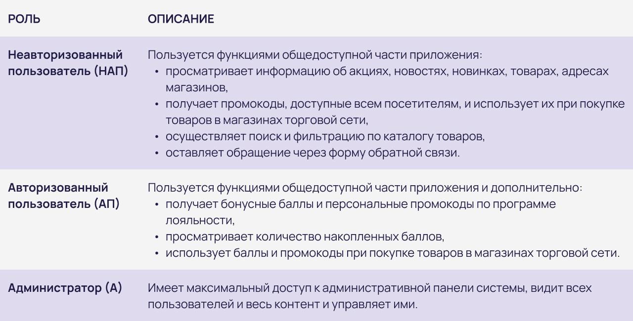 Здесь описываем роли в системе и права пользователей.